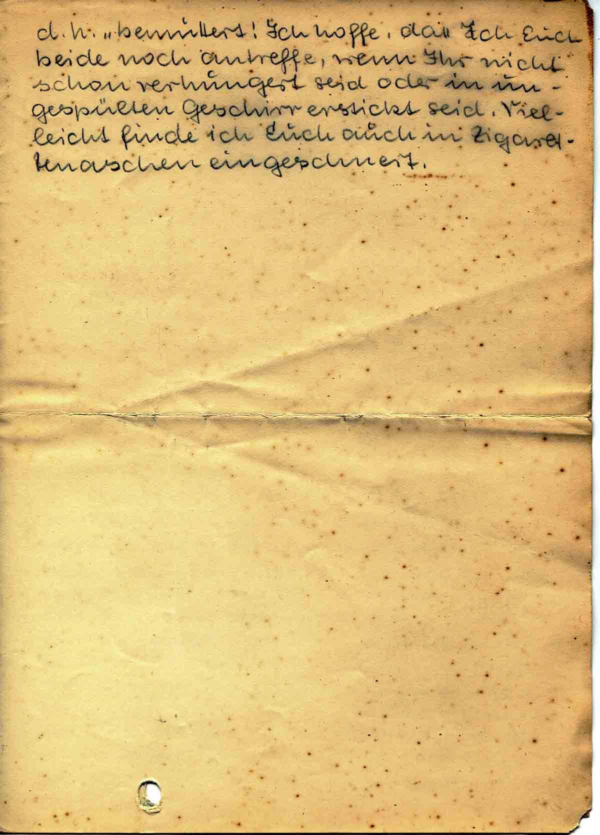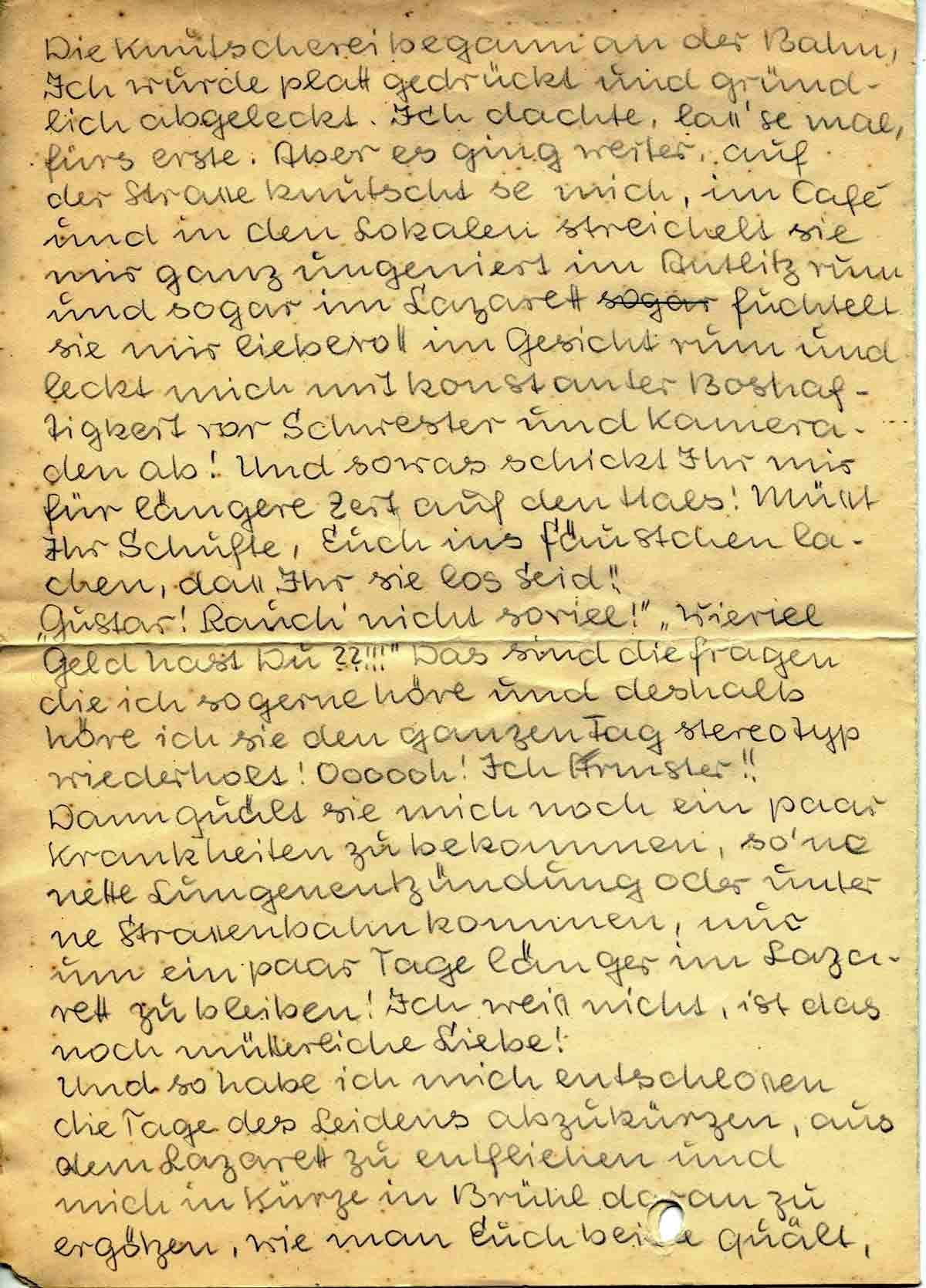 Die Knutscherei begann an der Bahn. Ich wurde platt gedrückt und gründlich abgeleckt. Ich dachte, lass’ se mal, fürs erste. Aber es ging weiter, auf der Strasse knutscht se mich, im Café und in den Lokalen streichelt sie mir ganz ungeniert im Antlitz rum und sogar im Lazarett fuchtelt sie mir liebevoll im Gesicht rum und leckt mich mit konstanter Boshaftigkeit vor Schwester und Kameraden ab! Und so was schickt Ihr mir für längere Zeit auf den Hals! Müsst Ihr Schufte, Euch ins Fäustchen lachen, dass Ihr sie los seid!!