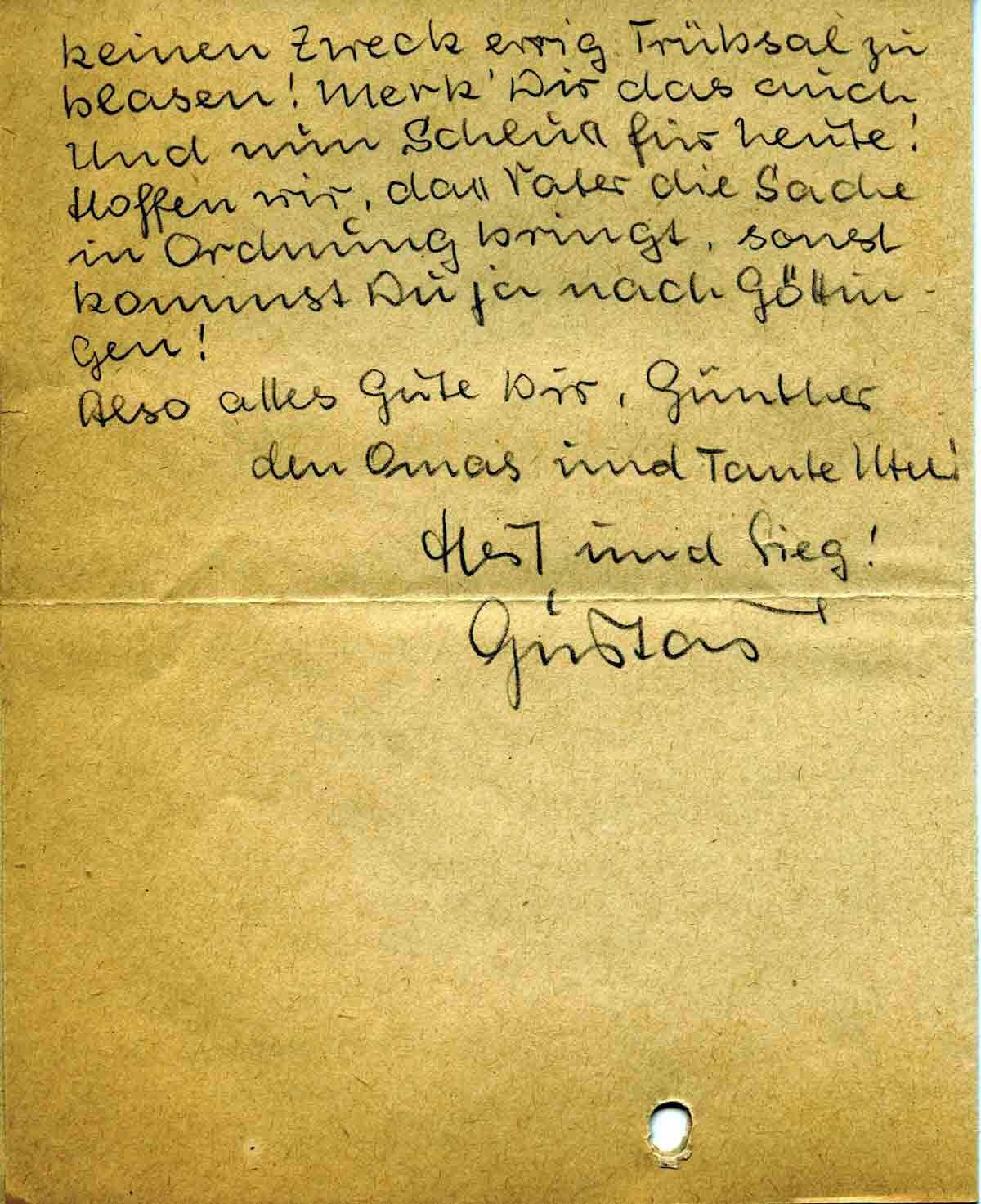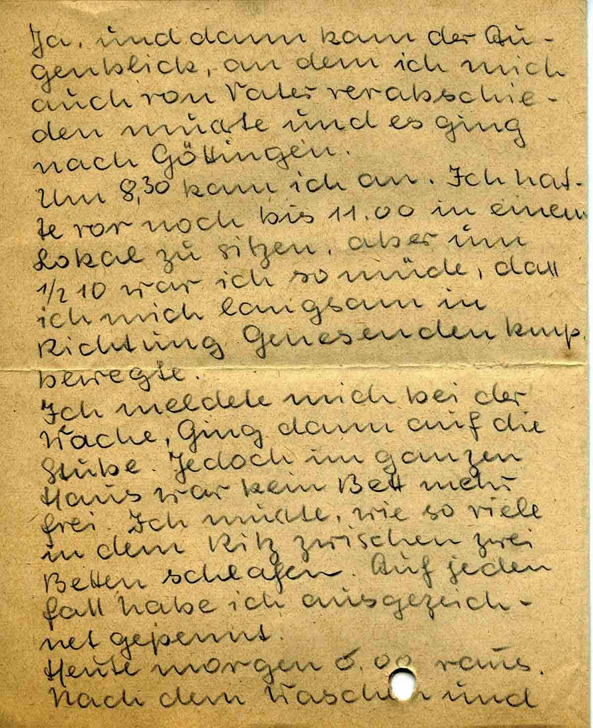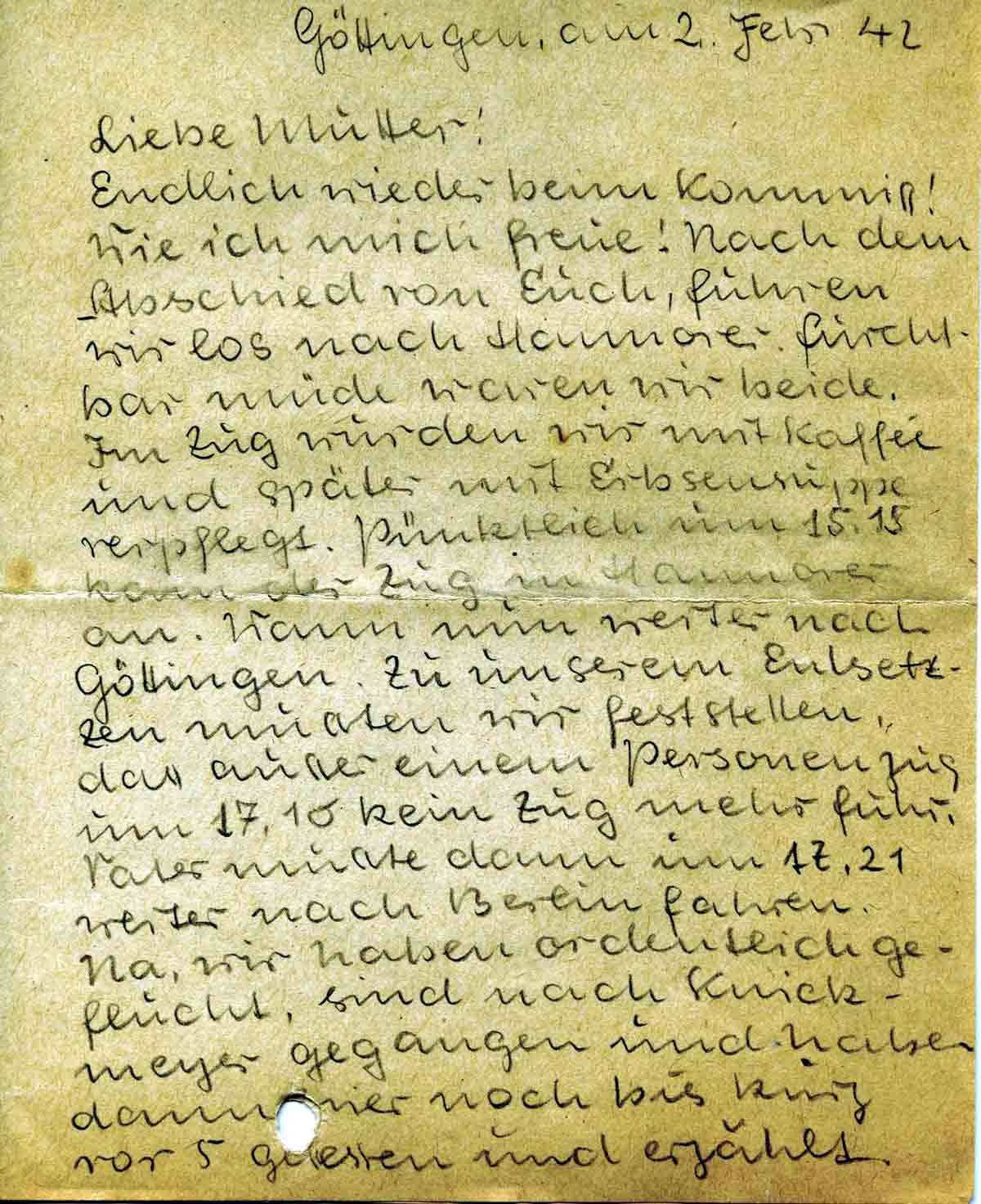 Endlich wieder beim Kommiss! Wie ich mich freue! Nach dem Abschied von Euch, fuhren wir los nach Hannover. Furchtbar müde waren wir beide. Im Zug wurden wir mit Kaffee und später mit Erbsensuppe verpflegt. Pünktlich um 15.15 kam der Zug in Hannover an. Wann nun weiter nach Göttingen. Zu unserem Entsetzen mussten wir feststellen, dass ausser einem Personenzug um 17.16 kein Zug mehr fuhr. Vater musste dann um 17.21 weiter nach Berlin fahren. Na, wir haben ordentlich geflucht, sind nach Knickmeyer gegangen und haben dann hier noch bis kurz vor 5 gesessen und erzählt.