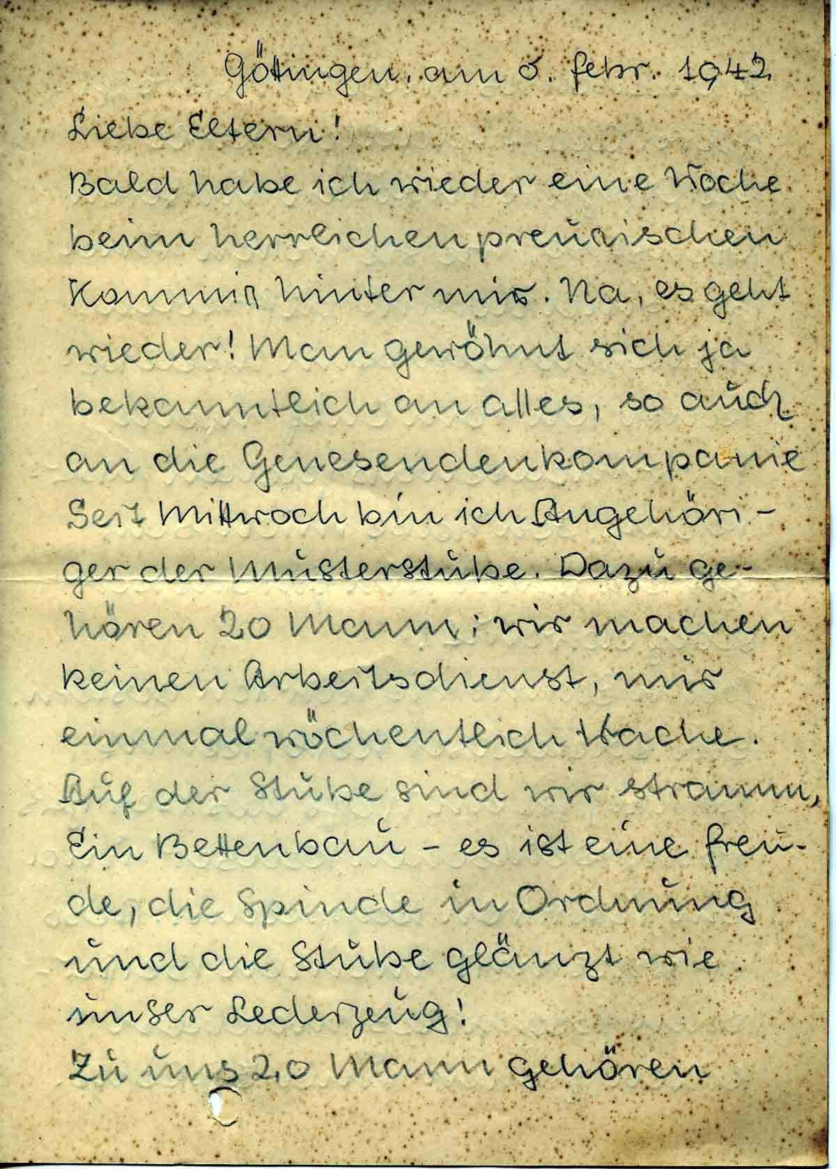 Bald habe ich wieder eine Woche beim herrlichen preussischen Kommiss hinter mir. Na, es geht wieder! Man gewöhnt sich ja bekanntlich an alles, so auch an die Genesungskompanie. Seit Mittwoch bin ich Angehöriger der Musterstube. Dazu gehören 20 Mann; wir machen keinen Arbeitsdienst, nur einmal wöchentlich Wache. Auf der Stube sind wir stramm. Ein Bettenbau – es ist eine Freude, die Spinde in Ordnung und die Stube glänzt wie unser Lederzeug!
