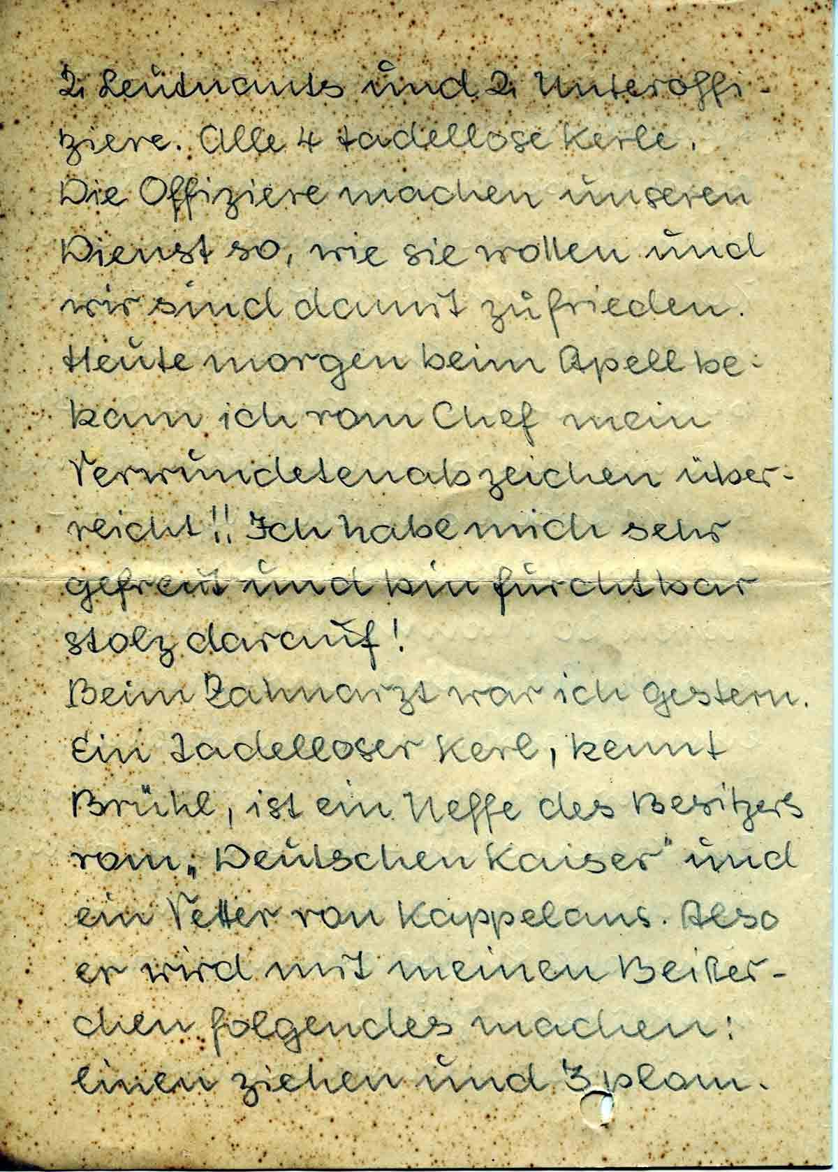 2 Leutnants und 2 Unteroffiziere. Alle 4 tadellose Kerle. Die Offiziere machen unseren Dienst so, wie sie wollen und wir sind damit zufrieden. Heute morgen beim Apell bekam ich vom Chef mein Verwundetenabzeichen überreicht!! Ich habe mich sehr gefreut und bin furchtbar stolz darauf!