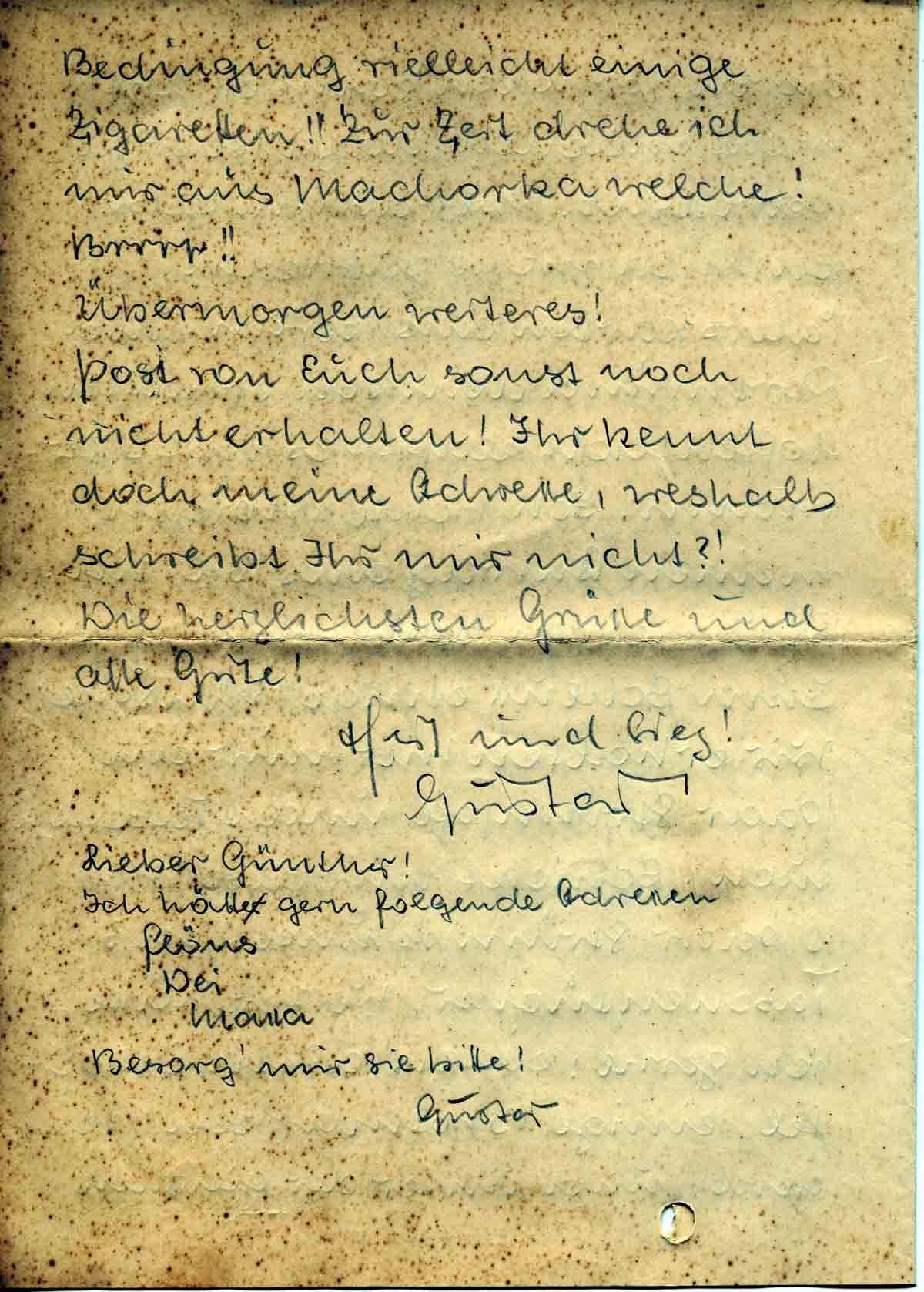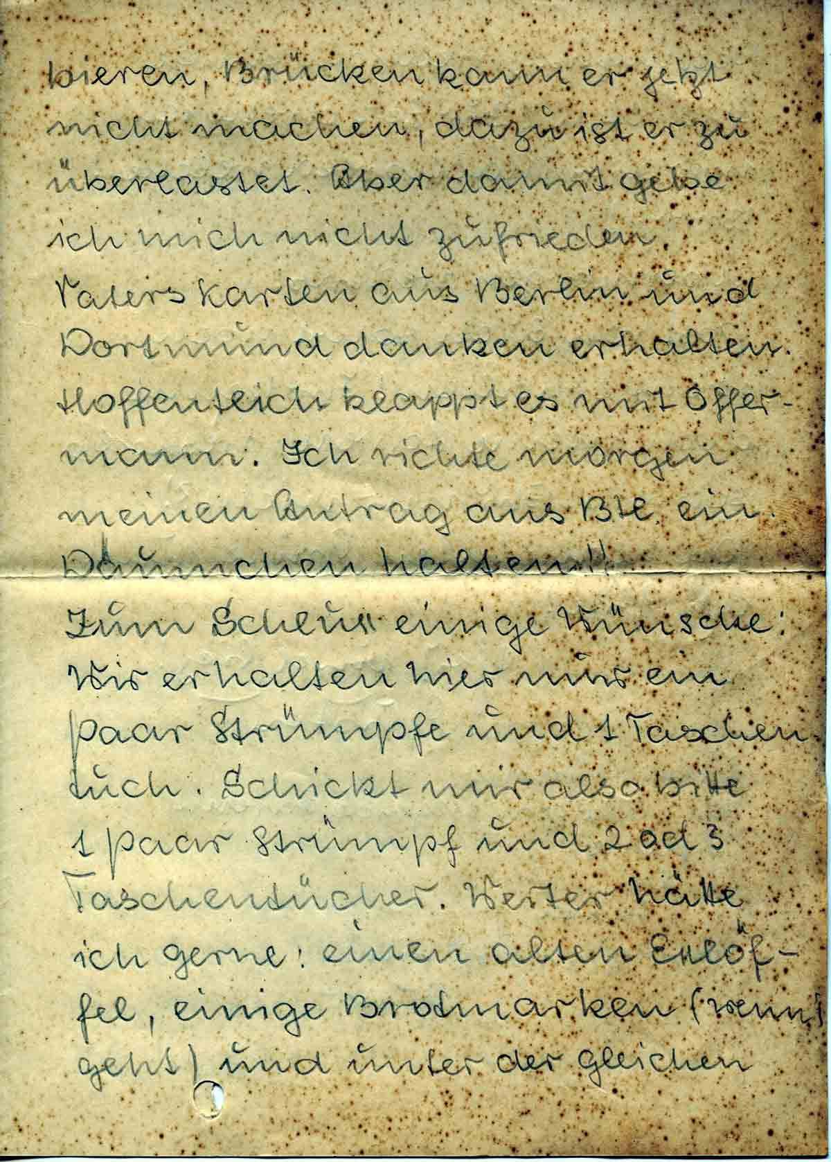 Wir erhalten hier nur ein Paar Strümpfe und 1 Taschentuch. Schickt mir also bitte 1 Paar Strumpf und 2 od. 3 Taschentücher. Weiter hätte ich gerne: einen alten Esslöffel, einige Brotmarken (wenn’s geht) und unter der gleichen