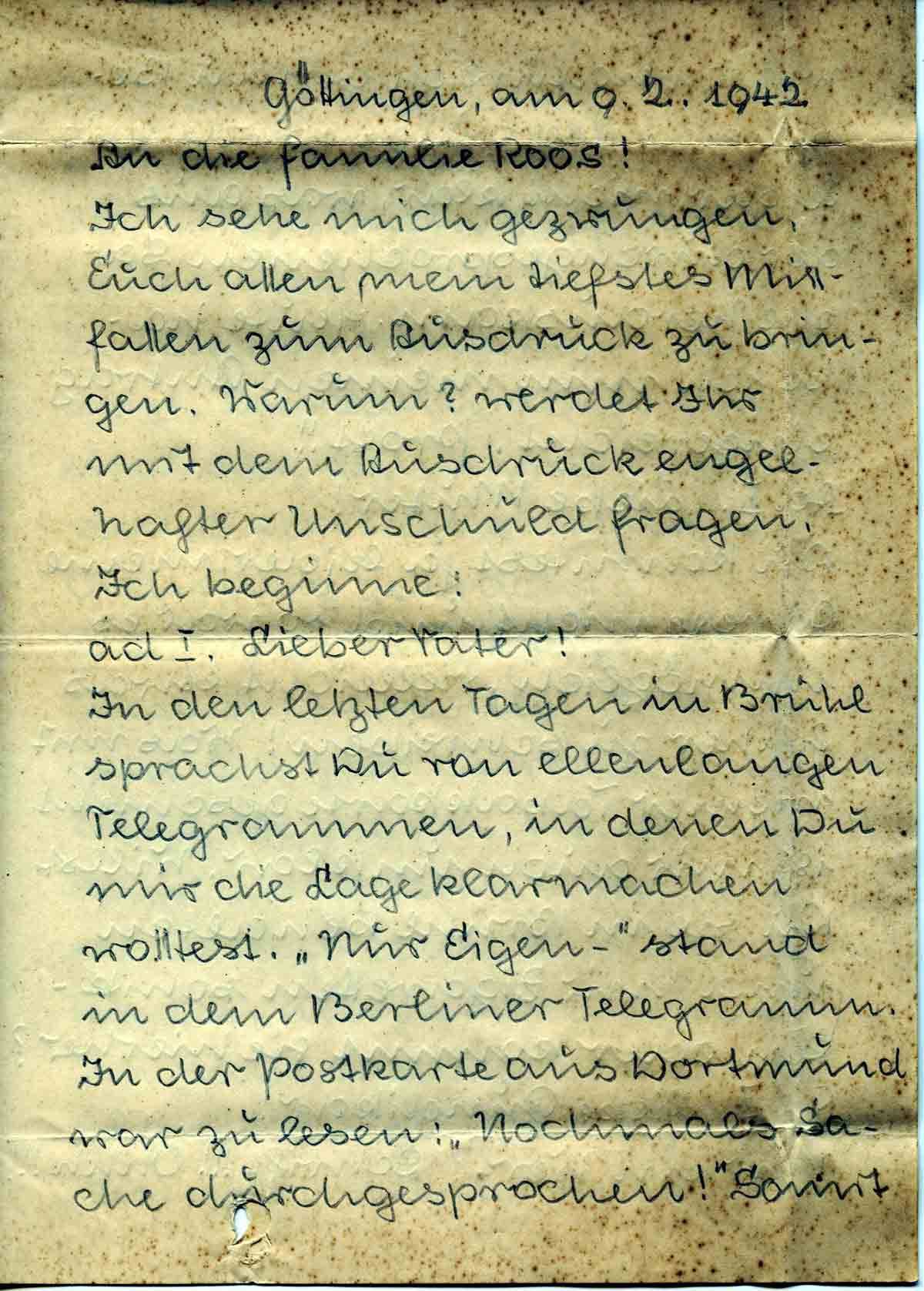 In den letzten Tagen in Brühl sprachst Du von ellenlangen Telegrammen, in denen Du mir die Lage klarmachen wolltest. „Nur Eigen-“ stand in dem Berliner Telegramm. In der Postkarte aus Dortmund war zu lesen: „Nochmals Sache durchgesprochen!“ Somit