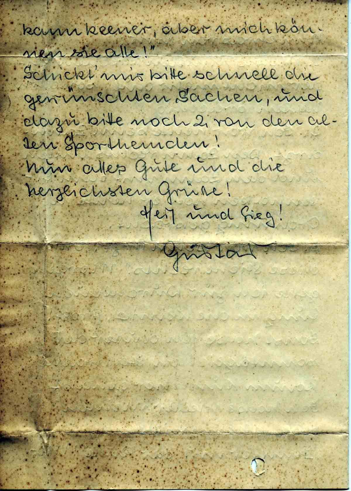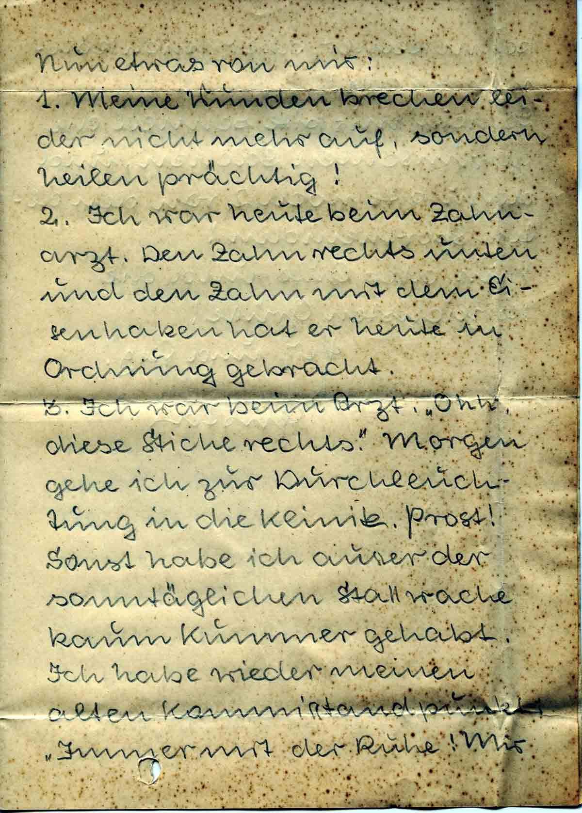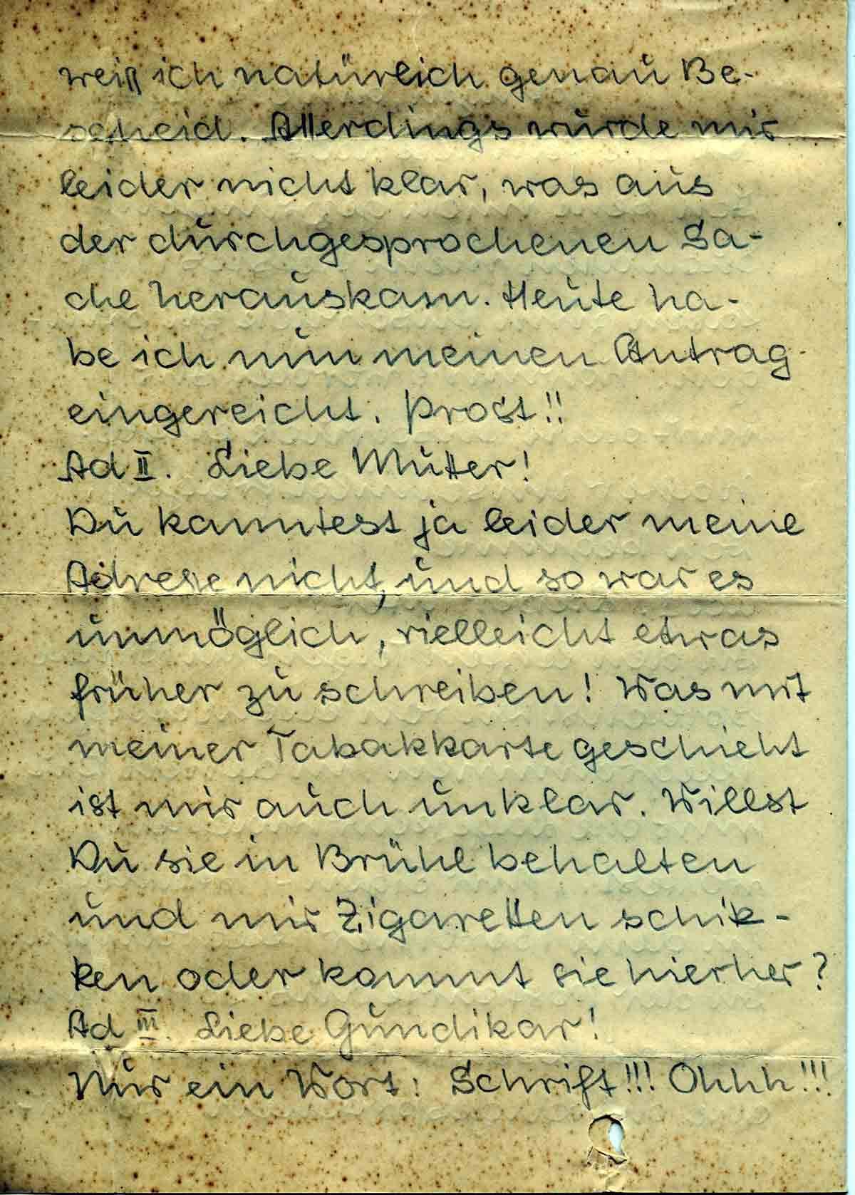 Du kanntest ja leider meine Adresse nicht, und so war es unmöglich, vielleicht etwas früher zu schreiben! Was mit meiner Tabakkarte geschieht ist mir auch unklar. Willst Du sie in Brühl behalten und mir Zigaretten schicken oder kommt sie hierher?