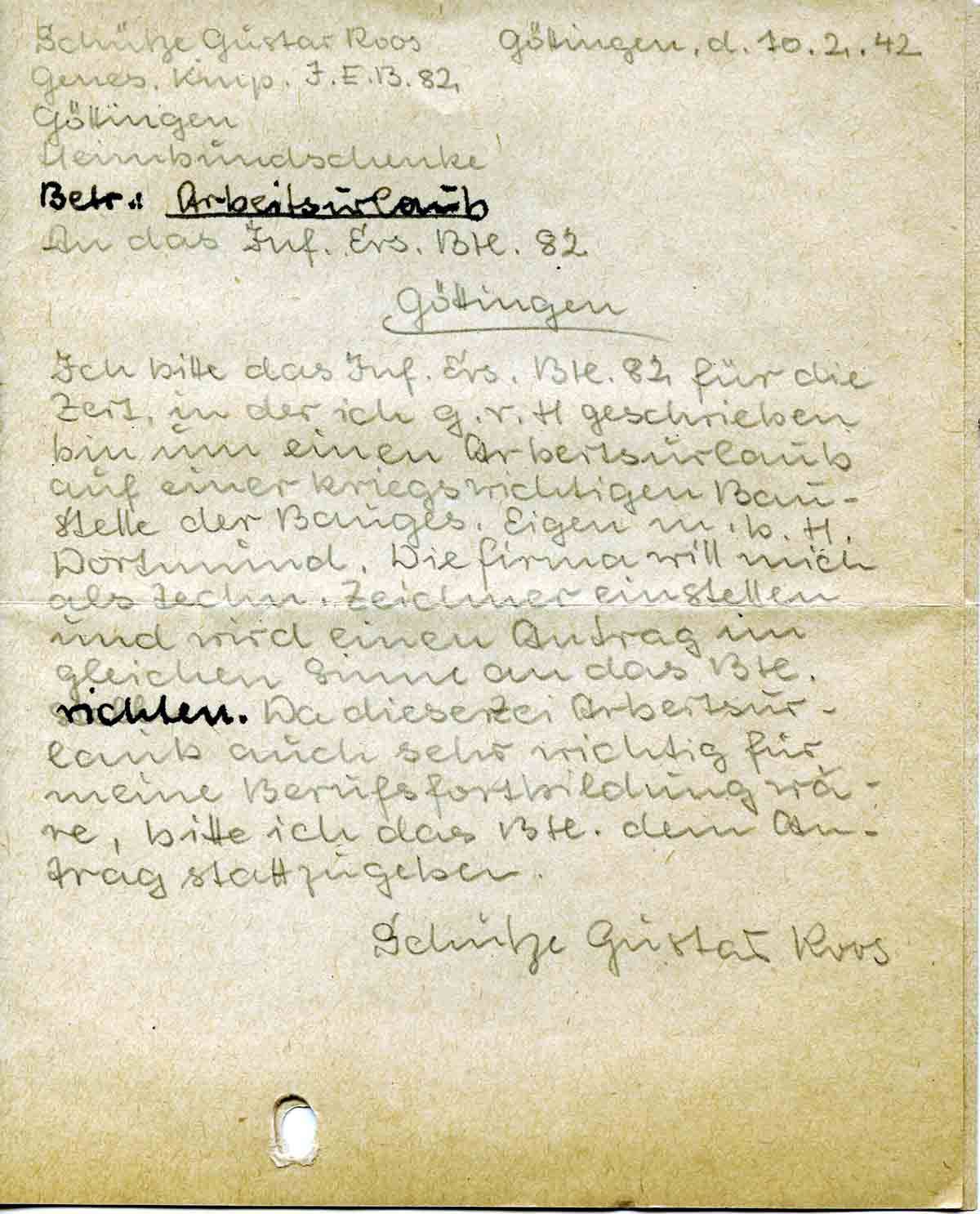 Ich bitte das Inf. Ers. Btl. 82 für die Zeit, in der ich g.v.H geschrieben bin um einen Arbeitsurlaub auf einer kriegswichtigen Baustelle der Bauges. Eigen m.b.H. Dortmund. Die Firma will mich als techn. Zeichner einstellen und wird einen Antrag im gleichen Sinne an das Btl. richten. Da dieserlei Arbeitsurlaub auch sehr wichtig für meine Berufsfortbildung wäre, bitte ich das Btl. dem Antrag stattzugeben.
