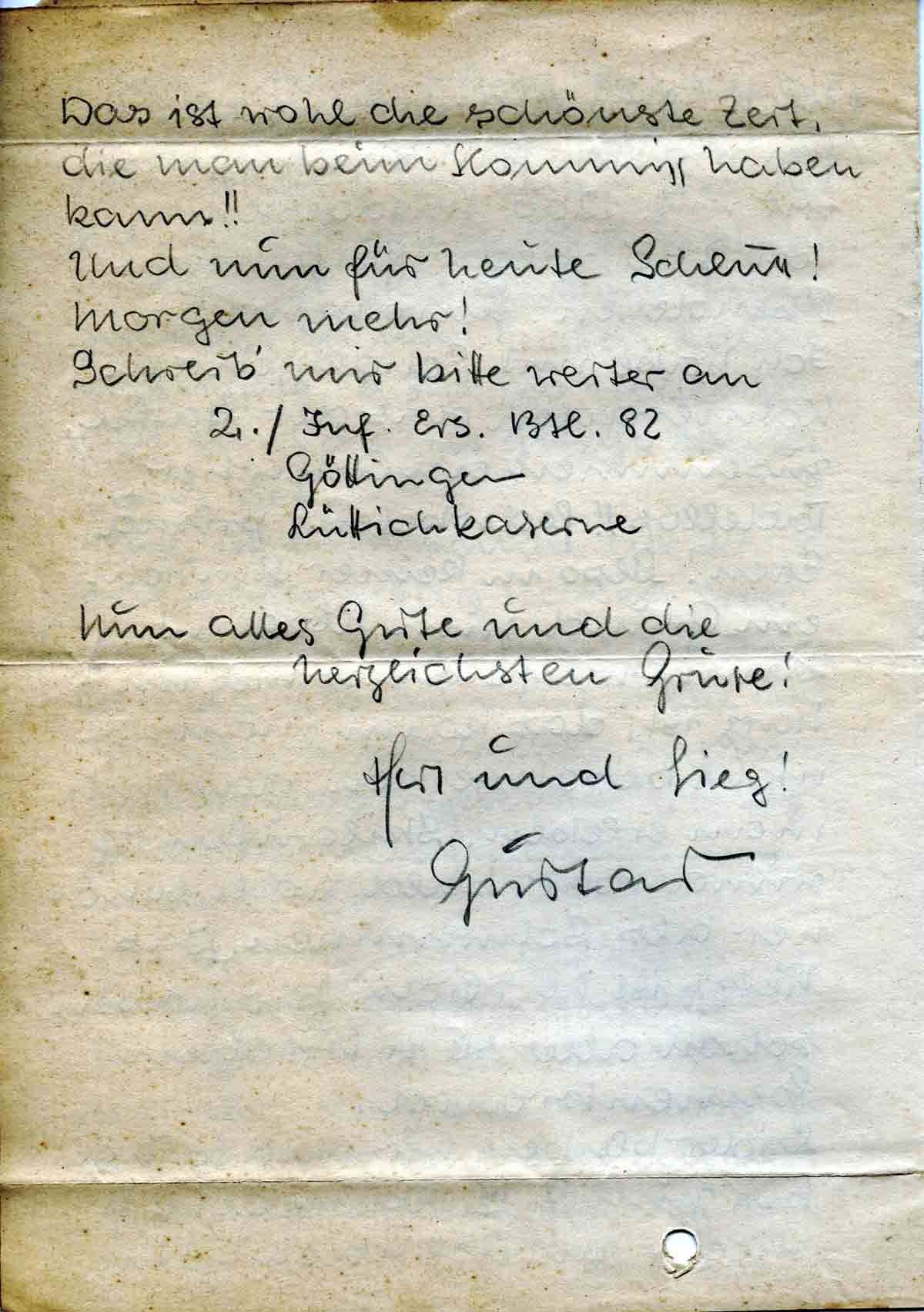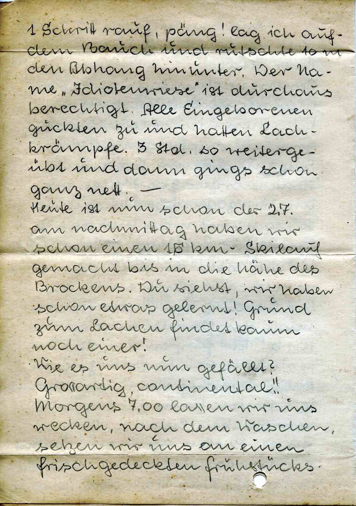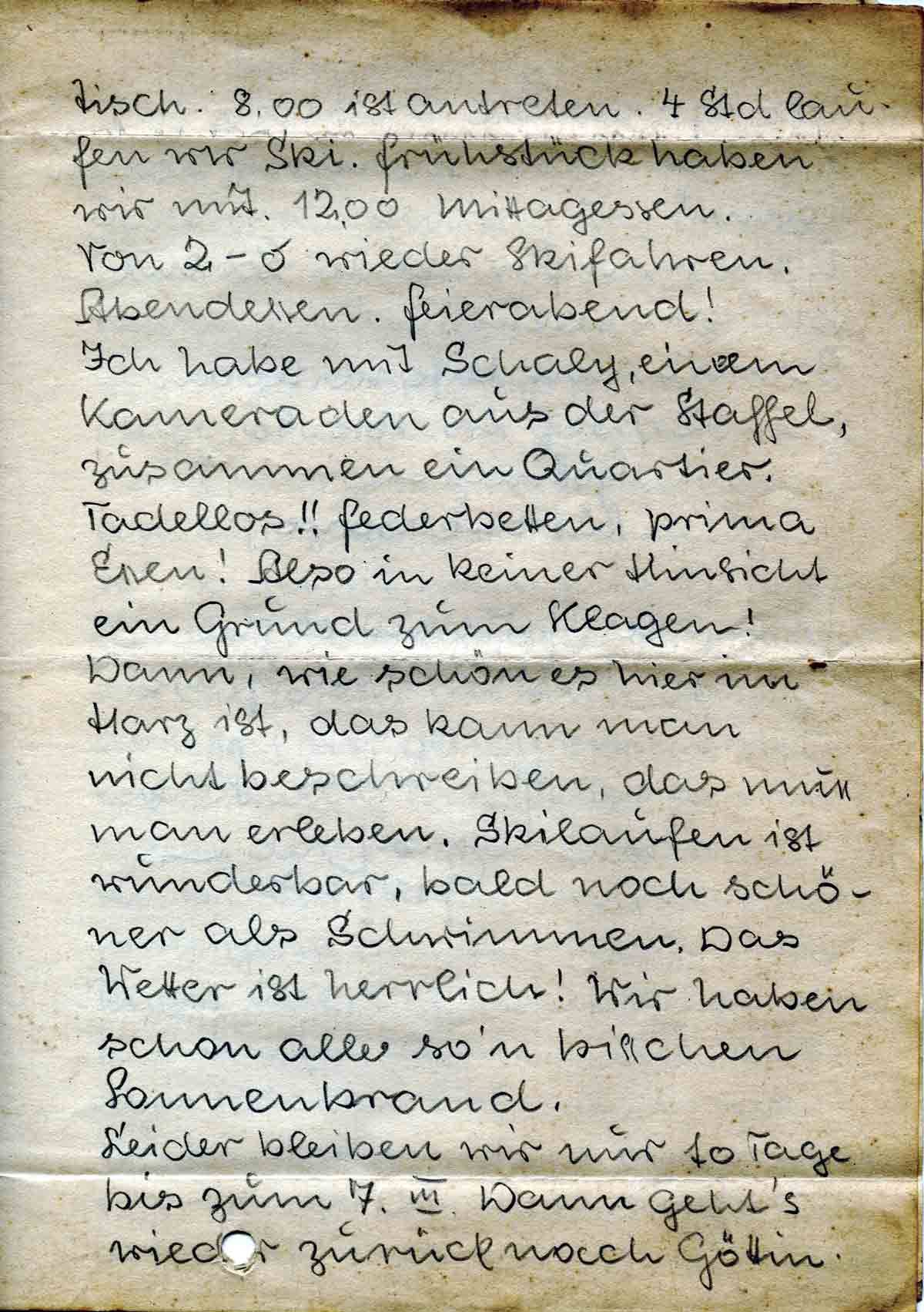 Ich habe mit Schaly, einem Kameraden aus der Staffel, zusammen ein Quartier. Tadellos!! Federbetten, prima Essen! Also in keiner Hinsicht ein Grund zum Klagen! Dann, wie schön es hier im Harz ist, das kann man nicht beschreiben, das muss man erleben. Skilaufen ist wunderbar, bald noch schöner als Schwimmen. Das Wetter ist herrlich! Wir haben schon alle so ’n bisschen Sonnenbrand.