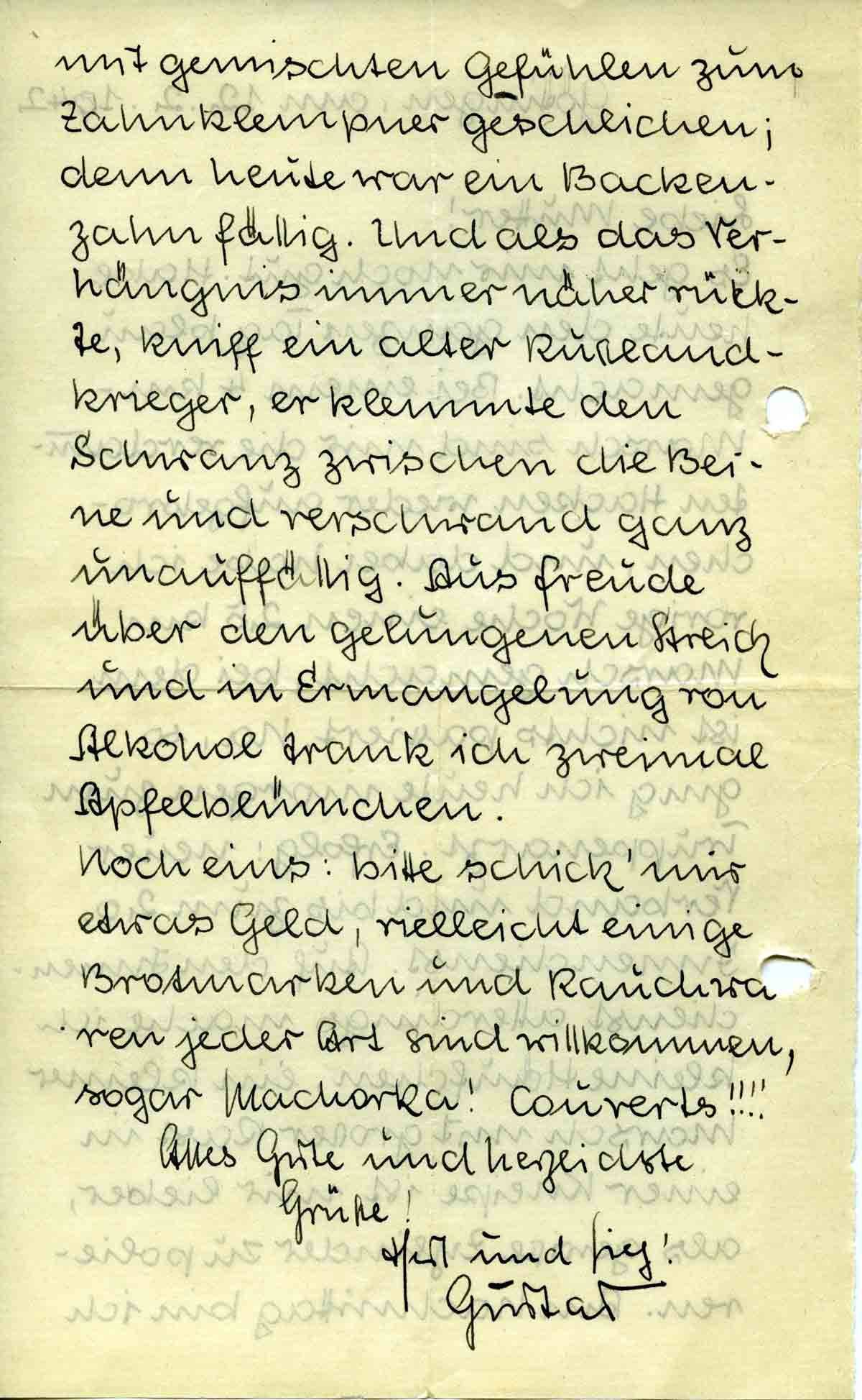 Noch eins: bitte schick’ mir etwas Geld, vielleicht einige Brotmarken und Rauchwaren jeder Art sind willkommen, sogar Machorka! Couverts!!!!