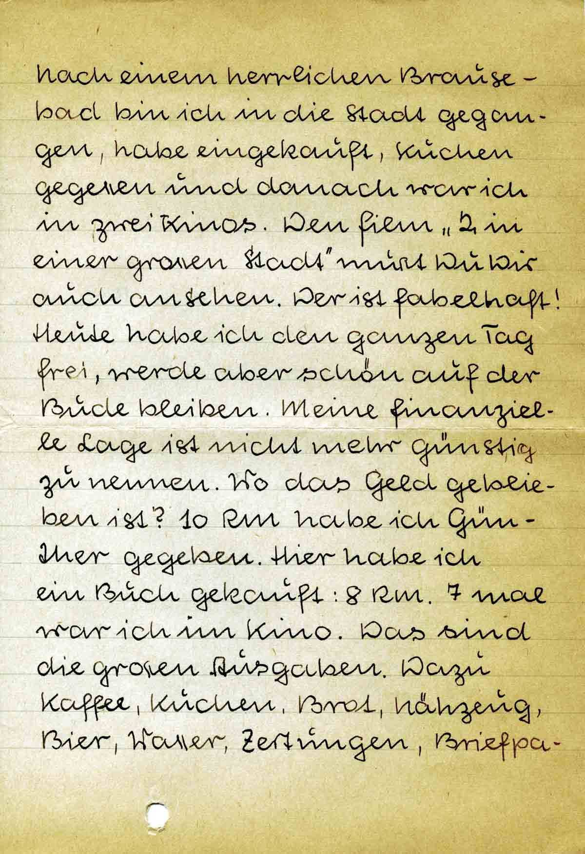 Nach einem herrlichen Brausebad bin ich in die Stadt gegangen, habe eingekauft, Kuchen gegessen und danach war ich in zwei Kinos. Den Film „2 in einer grossen Stadt“ musst Du Dir auch ansehen. Der ist fabelhaft! Heute habe ich den ganzen Tag frei, werde aber schön auf der Bude bleiben. Meine finanzielle Lage ist nicht mehr günstig zu nennen. Wo das Geld geblieben ist? 10 Rm habe ich Günther gegeben. Hier habe ich ein Buch gekauft: 8 Rm. 7 mal war ich im Kino. Das sind die grossen Ausgaben. Dazu Kaffee, Kuchen, Brot, Nähzeug, Bier, Wasser, Zeitungen, Briefpa-