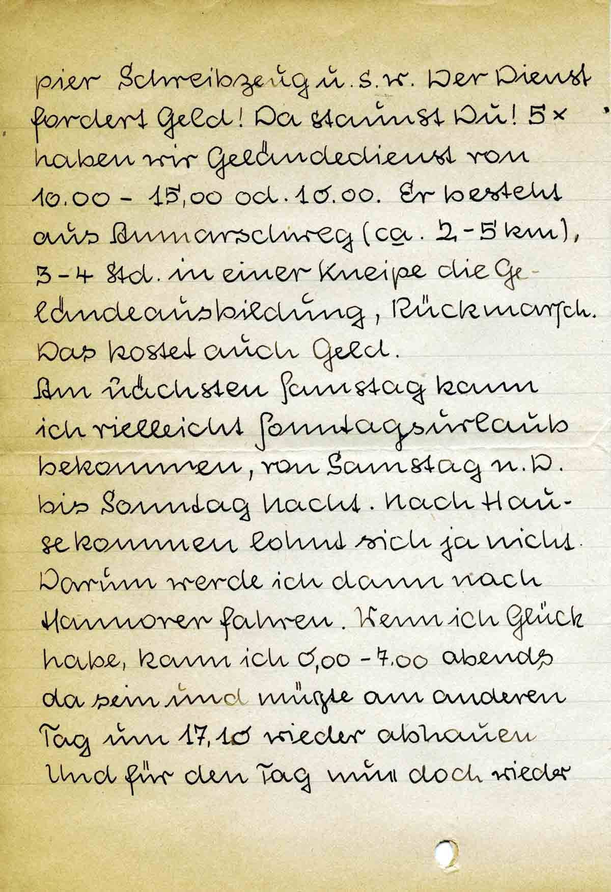 pier, Schreibzeug u. s. w. Der Dienst fordert Geld! Da staunst Du! 5 x haben wir Geländedienst von 10.00-15.00 od. 16.00. Er besteht aus Anmarschweg (ca. 2-5 km), 3-4 Std. in einer Kneipe die Geländeausbildung, Rückmarsch. Das kostet auch Geld.