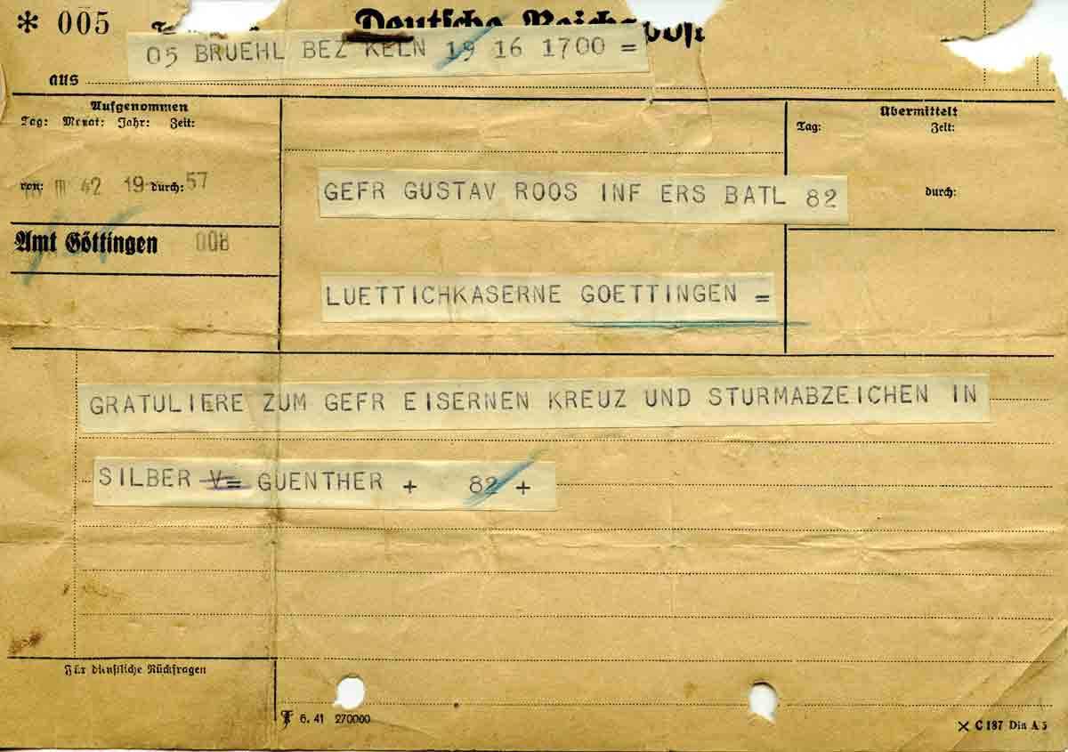 Günther Roos an Bruder Gustav, 18. März 1942 05 Bruehl Bez. Keln 19 16 1700 = 18.III.42 Gefr. Gustav Roos Inf Ers Batl 82 Luettichkaserne Goettingen = Gratuliere zum Gefr Eisernen Kreuz und Sturmabzeichen in Silber Guenther + 82 +