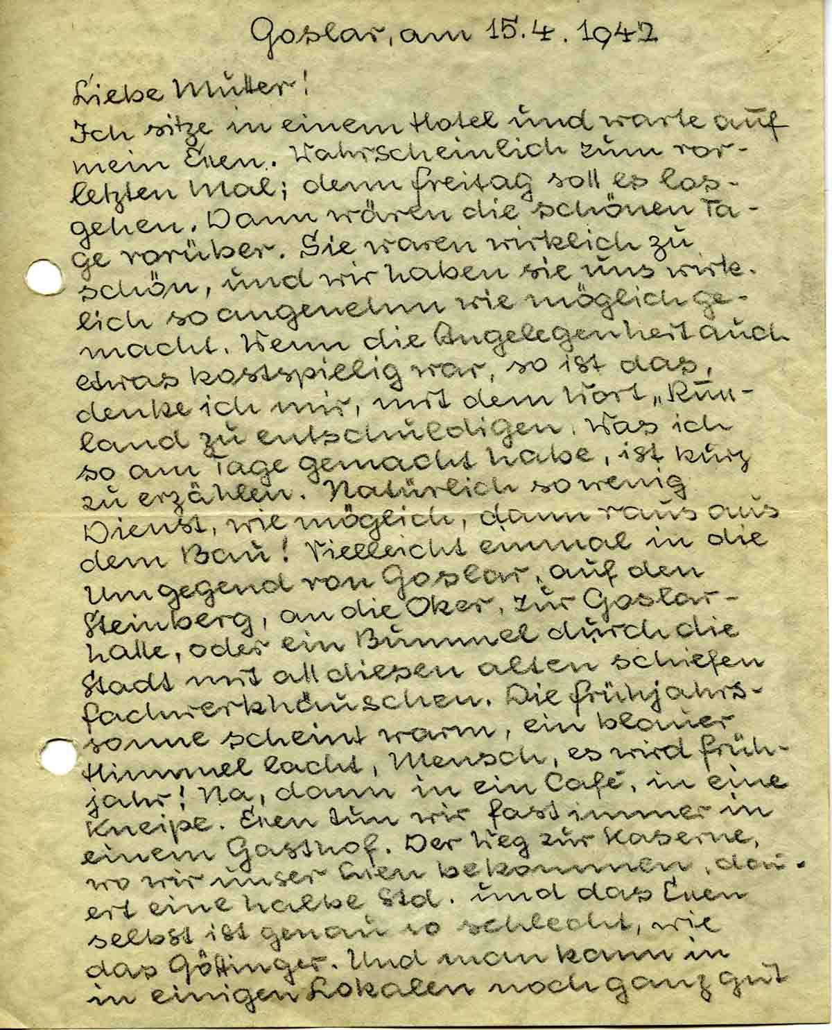 Ich sitze in einem Hotel und warte auf mein Essen. Wahrscheinlich zum vorletzten Mal; denn Freitag soll es losgehen. Dann wären die schönen Tage vorüber. Sie waren wirklich zu schön, und wir haben sie uns wirklich so angenehm wie möglich gemacht. Wenn die Angelegenheit auch etwas kostspielig war, so ist das, denke ich mir, mit dem Wort „Russland“ zu entschuldigen. Was ist so am Tage gemacht habe, ist kurz zu erzählen. Natürlich so wenig Dienst, wie möglich, dann raus aus dem Bau! Vielleicht einmal in die Umgegend von Goslar, auf den Steinberg, an die Oker, zur Goslarhalle, oder ein Bummel durch die Stadt mit all diesen alten schiefen Fachwerkhäuschen. Die Frühjahrssonne scheint warm, ein blauer Himmel lacht, Mensch, es wird Frühling! Na, dann in ein Café, in eine Kneipe. Essen tun wir fast immer in einem Gasthof. Der Weg zur Kaserne, wo wir unser Essen bekommen, dauert eine halbe Std. und das Essen selbst ist genau so schlecht, wie das Göttinger. Und man kann in einigen Lokalen noch ganz gut