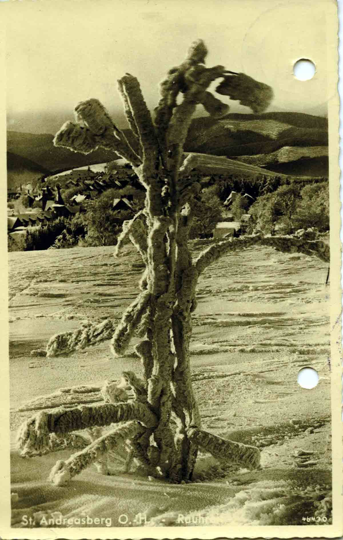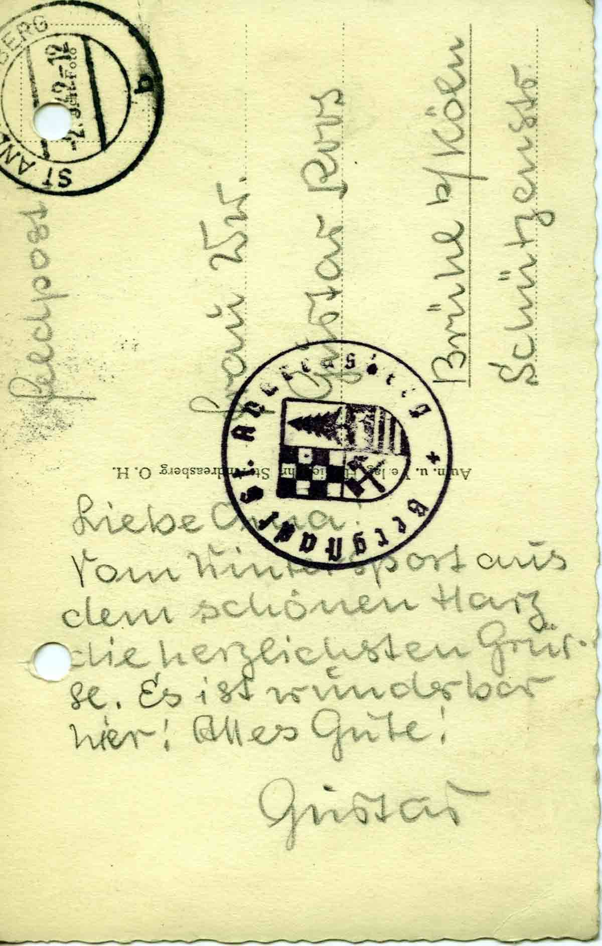 Gustav Roos an seine Oma, 2. März 1942 [? Poststempel] St. Andreasberg O.-H. Frau Ww. Gustav Roos Brühl b/Köln Schützenstr. Liebe Oma! Vom Wintersport aus dem schönen Harz die herzlichsten Grüsse. Es ist wunderbar hier! Alles Gute! Gustav