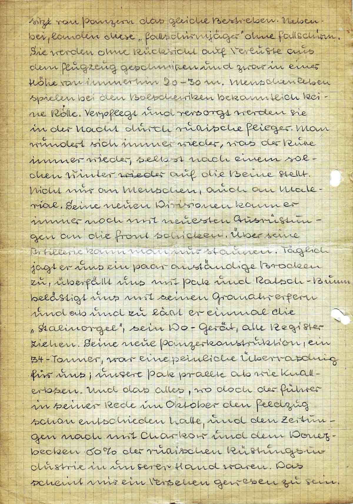 sitz von Panzern das gleiche Bestreben. Nebenbei, landen diese „Fallschirmjäger“ ohne Fallschirm. Sie werden ohne Rücksicht auf Verluste aus dem Flugzeug geschmissen und zwar in einer Höhe von immerhin 20-30 m. Menschenleben spielen bei den Bolschewiken bekanntlich keine Rolle. Verpflegt und versorgt werden sie in der Nacht durch russische Flieger. Man wundert sich immer wieder, was der Russe immer wieder, selbst nach einem solchen Winter auf die Beine stellt. Nicht nur an Menschen, auch an Material. Seine neuen Divisionen kann er immer noch mit neuesten Ausrüstungen an die Front schicken. Über seine Artillerie kann man nur staunen. Täglich jagt er uns ein paar anständige Brocken zu, überfallt uns mit Pak und Ratsch-Bumm belästigt uns mit seinen Granatwerfern und ab und zu lässt er einmal die „Stalinorgel“, sein Do-Gerät, alle Register ziehen. Seine neue Panzerkonstruktion, ein 34-Tonner, war eine peinliche Überraschung für uns; unsere Pak prallte ab wie Knallerbsen. Und das alles, wo doch der Führer in seiner Rede im Oktober den Feldzug schon entschieden hatte, und den Zeitungen nach mit Charkow und dem Donezbecken 60 % der russischen Rüstungsindustrie in unserer Hand waren. Das scheint mir ein Versehen gewesen zu sein.