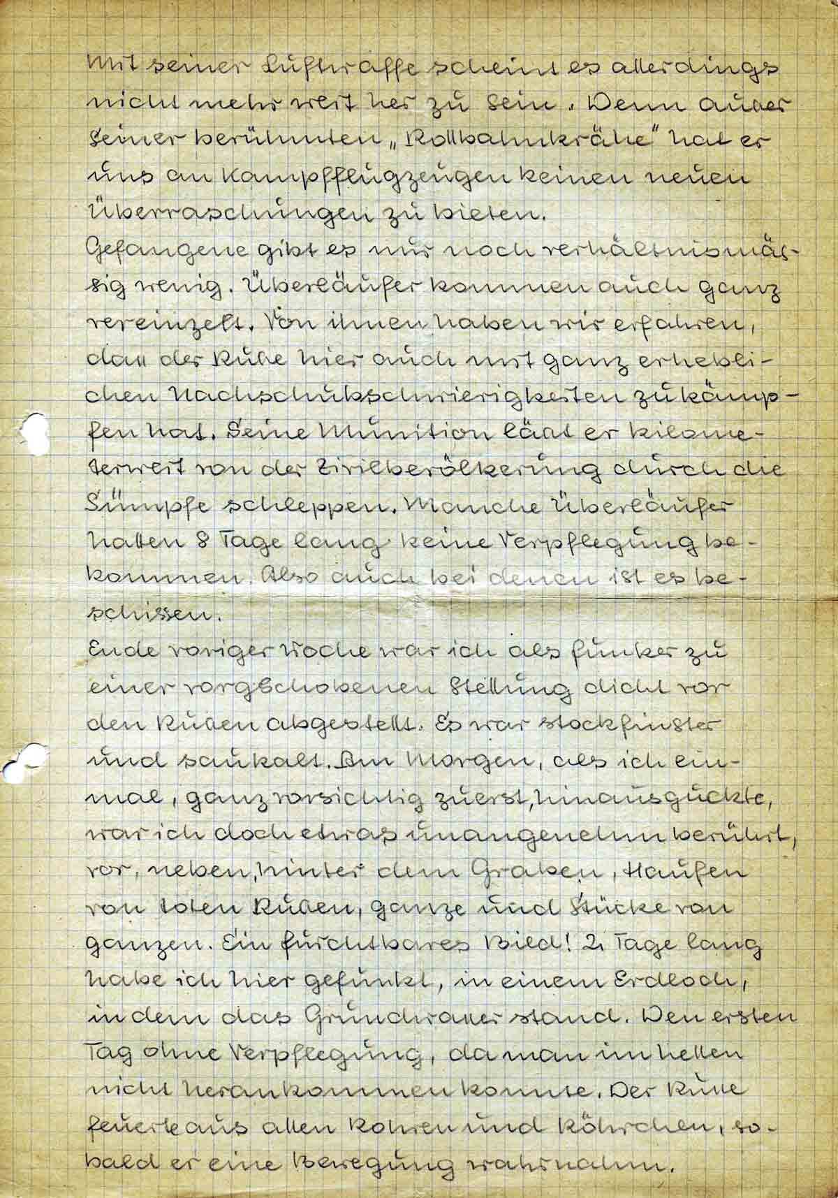 Und nun will ich Dir etwas von meinen Erlebnissen der letzten 14 Tage erzählen. In R., wo wir ausgeladen wurden, traf ich unseren neuen Staffelführer. Der erzählte mir, was vorne bei uns los war. Ich vernahm und war erschüttert, mehr als erschüttert! Es erfolgte der Marsch, 120 km auf der Rollbahn gen Osten und dann war ich bei meinem alten Regiment. Ich konnte mich nun von allem selbst überzeugen und war noch erschütterter, wenn es das noch geben kann.