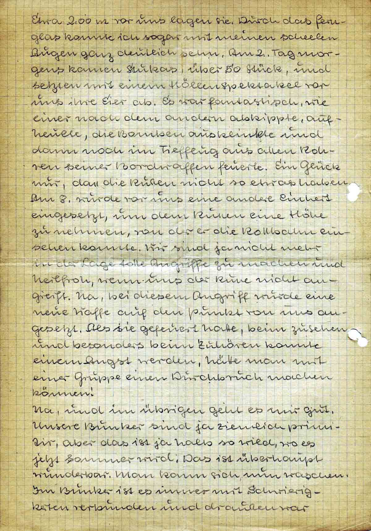 Na, und im übrigen geht es mir gut. Unsere Bunker sind ja ziemlich primitiv, aber das ist ja halb so wild, wo es jetzt Sommer wird. Das ist überhaupt wunderbar. Man kann sich nun waschen. Im Bunker ist es immer mit Schwierigkeiten verbunden und draussen war
