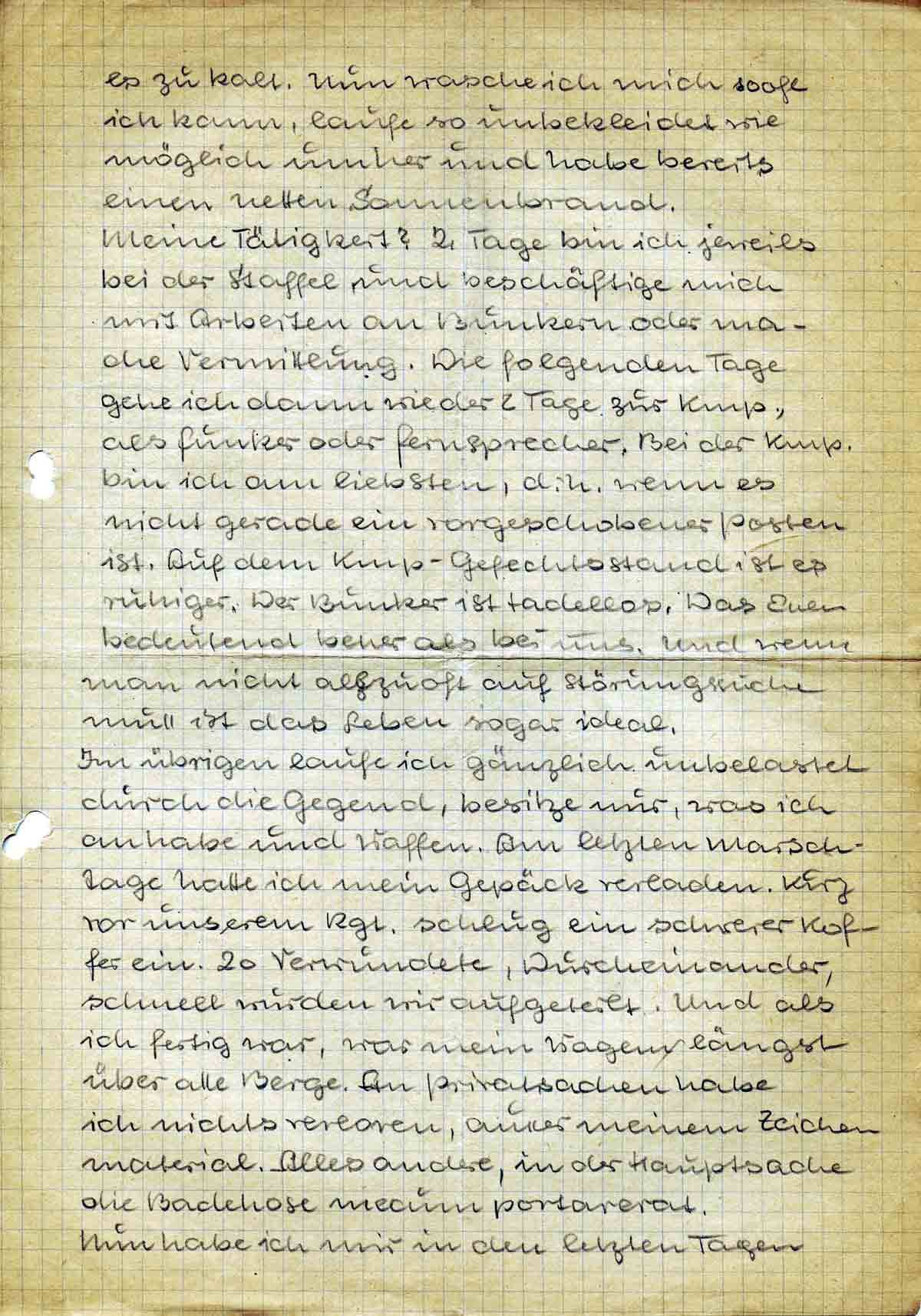 Meine Tätigkeit? 2 Tage bin ich jeweils bei der Staffel und beschäftige mich mit Arbeiten an Bunkern oder mache Vermittlung. Die folgenden Tage gehe ich dann wieder 2 Tage zur Kmp., als Funker oder Fernsprecher. Bei der Kmp. bin ich am liebsten, d. h. wenn es nicht gerade ein vorgeschobener Posten ist. Auf dem Kmp-Gefechtsstand ist es ruhiger. Der Bunker ist tadellos. Das Essen bedeutend besser als bei uns. Und wenn man nicht allzuoft auf Störungssuche muss ist das Leben sogar ideal.