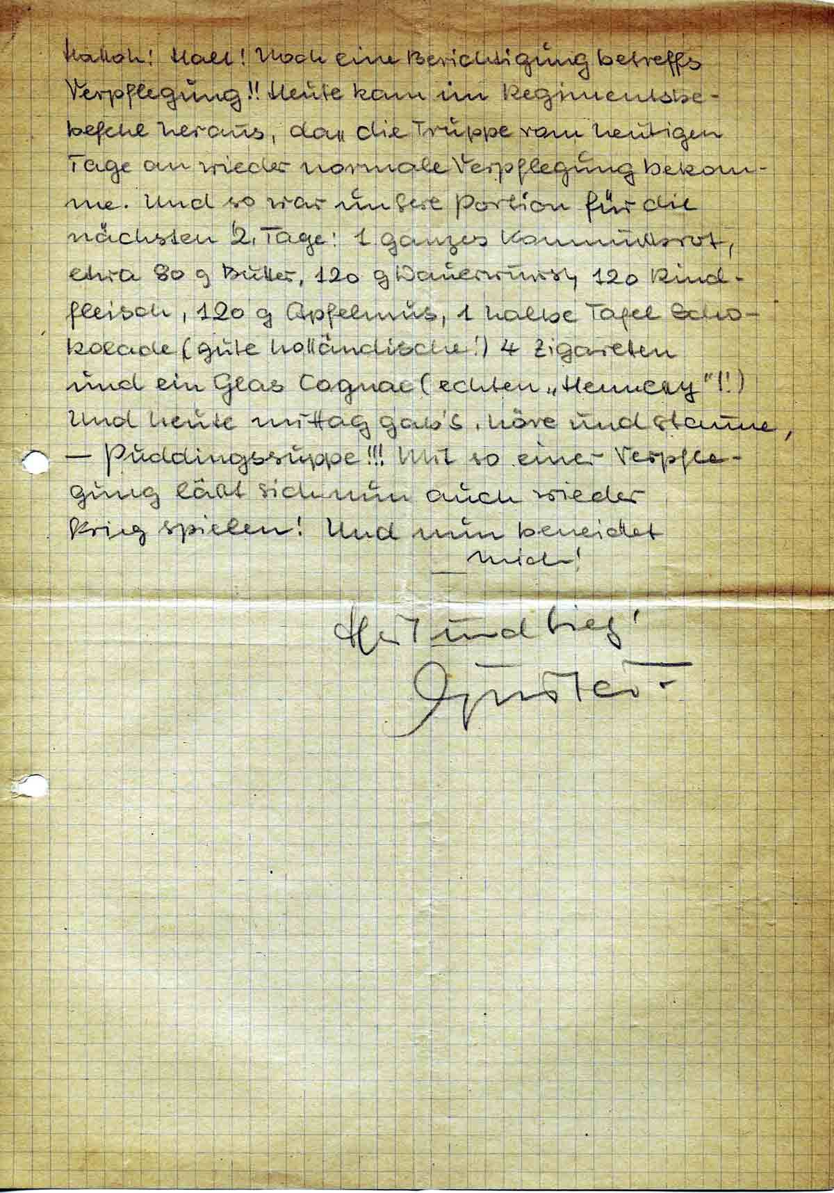 Halloh! Halt! Noch eine Berichtigung betreffs Verpflegung!! Heute kam im Regimentsbefehl heraus, dass die Truppe vom heutigen Tage an wieder normale Verpflegung bekomme. Und so war unsere Portion für die nächsten 2 Tage: 1 ganzes Kommissbrot, etwa 80 g Butter, 120 g Dauerwurst, 120 Rindfleisch, 120 g Apfelmus, 1 halbe Tafel Schokolade (gute holländische!) 4 Zigaretten und ein Glas Cognac (echten „Hennessy“!!) Und heute mittag gab’s, höre und staune, - Puddingssuppe!!! Mit so einer Verpflegung läßt sich nun auch wieder Krieg spielen! Und nun beneidet mich!