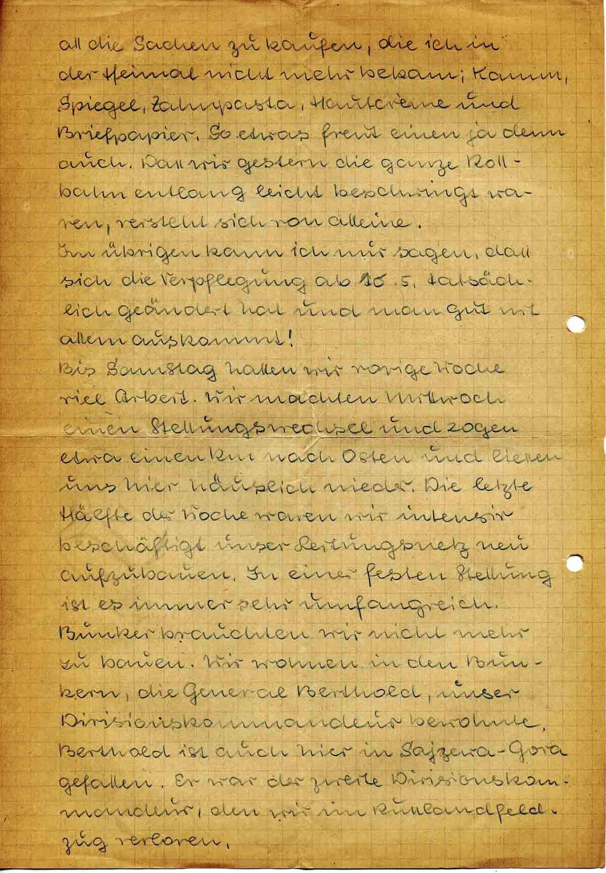 Bis Samstag hatten wir vorige Woche viel Arbeit. Wir machten Mittwoch einen Stellungswechsel und zogen etwa einen km nach Osten und liessen uns hier häuslich nieder. Die letzte Hälfte der Woche waren wir intensiv beschäftigt unser Leitungsnetz neu aufzubauen. In einer festen Stellung ist es immer sehr umfangreich. Bunker brauchten wir nicht mehr zu bauen. Wir wohnen in den Bunkern, die General Berthold, unser Divisionskommandeur bewohnte. Berthold ist auch hier in Sajzewa-Gora gefallen. Er war der zweite Divisionskommandeur, den wir im Russlandfeldzug verloren.