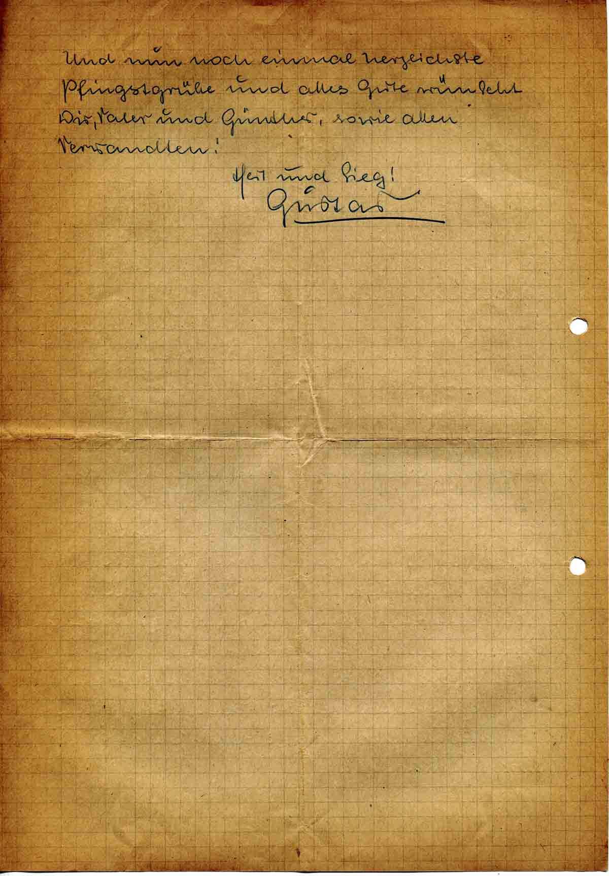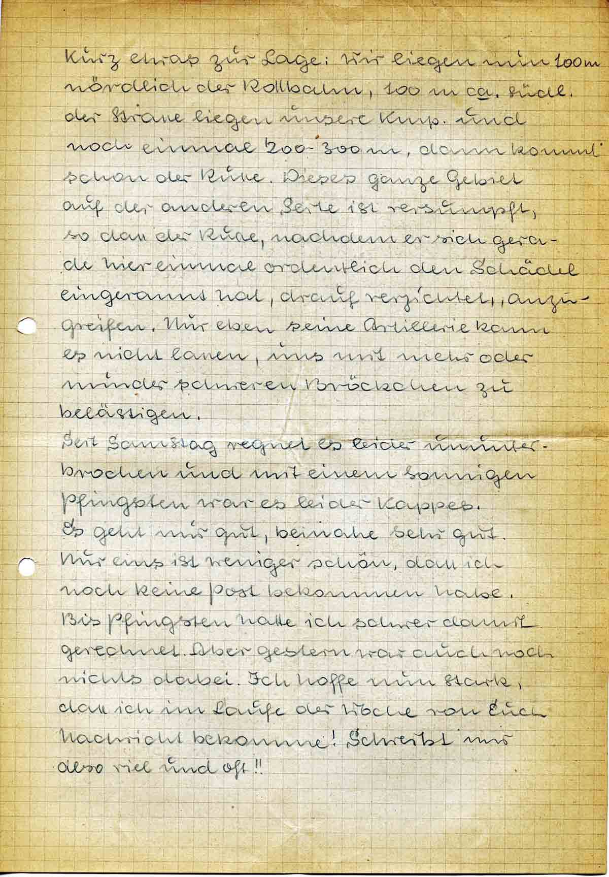 Der erste Pfingsttag liegt hinter mir und auch der zweite geht zu Ende. Getan haben wir gestern kaum etwas. Auch der Russe war ruhig, so dass wir den ganzen Tag keine Leitungsstörung hatten. Also hatten wir Zeit uns zu waschen, gründlich zu lausen, zu essen und zu lesen. Am Abend habe ich dann Karl-Dieter Frees besucht, der ja vor mir schon wieder hierhin kam und nun seinen Wigwam nahe bei unserem Bunker aufgeschlagen hatte. Die Verpflegung für die beiden Festtage war so gut, dass es sich lohnt Euch einmal den Mund wässerig zu machen. Unsere kalte Verpflegung bestand aus: 1 Kommissbrot, Butter, Käse, Bierwurst, Marmelade, Drops u. 12 Zigaretten. Morgens kam Bohnenkaffee und zu Mittag assen wir grüne Bohnen mit Rindfleisch. An Marketenderwaren bekam jeder 100 Zigaretten, 1 Paket Feinschnitt, 20 Zigarren, Blättchen, 1/3 Flasche Sekt, 1 l Rotwein und ½ l Cognac, Rum oder Likör. Dazu waren