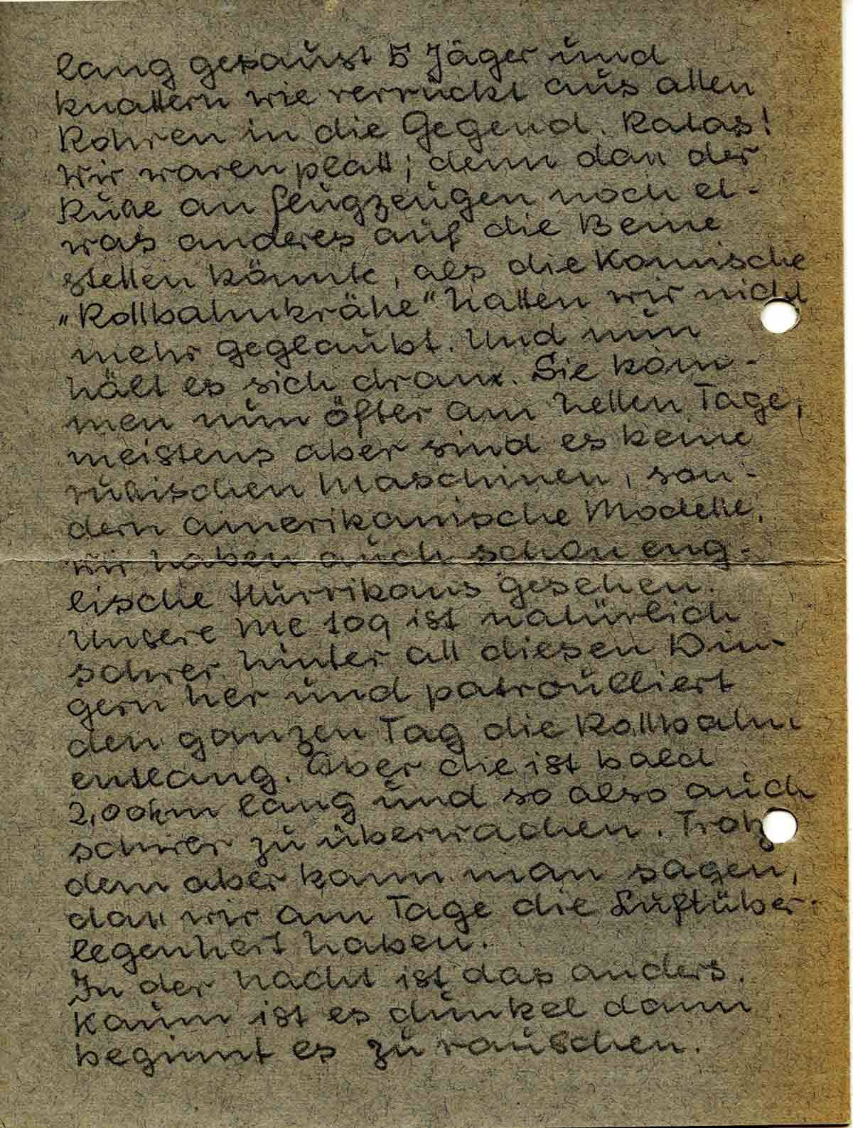 lang gesaust 5 Jäger und knattern wie verrückt aus allen Rohren in die Gegend. Ratas! Wir waren platt; denn dass der Russe an Flugzeugen noch etwas anderes auf die Beine stellen könnte, als die komische „Rollbahnkrähe“ hatten wir nicht mehr geglaubt. Und nun hält es sich dran. Sie kommen nun öfter am hellen Tage, meisten aber sind es keine russischen Maschinen, sondern amerikanische Modelle. Wir haben auch schon englische Hurrikans gesehen. Unsere Me 109 ist natürlich schwer hinter all diesen Dingern her und patrouilliert den ganzen Tag die Rollbahn entlang. Aber die ist bald 200 km lang und so also auch schwer zu überwachen. Trotzdem aber kann man sagen, dass wir am Tage die Luftüberlegenheit haben.