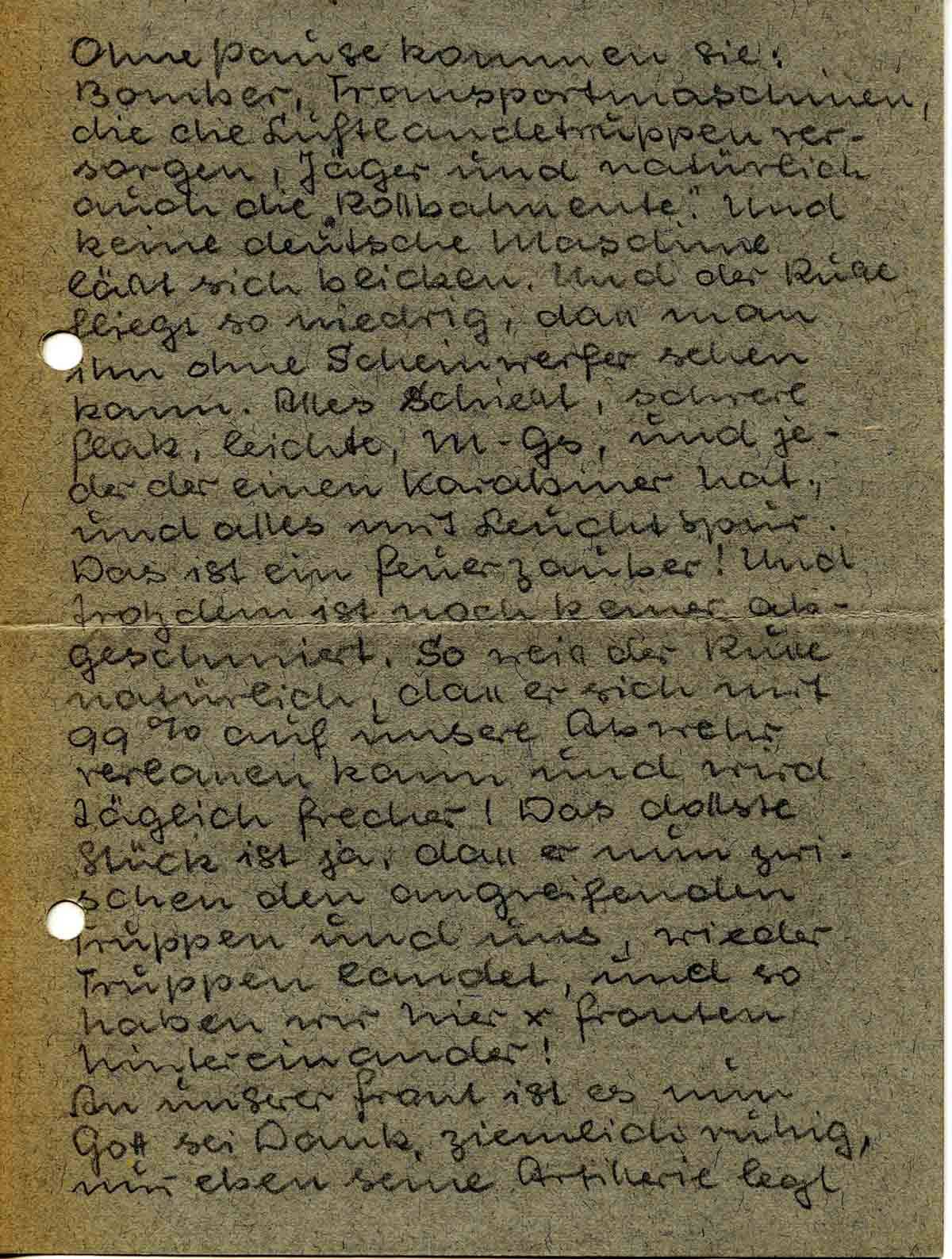 Ohne Pause kommen sie: Bomber, Transportmaschinen, die die Luftlandetruppen versorgen, Jäger und natürlich auch die „Rollbahnente“. Und keine deutsche Maschine lässt sich blicken. Und der Russe fliegt so niedrig, dass man ihn ohne Scheinwerfer sehen kann. Alles schiesst, schwere Flak, leichte, M-Gs, und jeder der einen Karabiner hat, und alles mit Leuchtspur. Das ist ein Feuerzauber! Und trotzdem ist noch keiner abgeschmiert. So weiss der Russe natürlich, dass er sich mit 99 % auf unsere Abwehr verlassen kann und wird täglich frecher! Das dollste Stück ist ja, dass er nun zwischen den angreifenden Truppen und uns, wieder Truppen landet, und so haben wir hier x Fronten hintereinander!