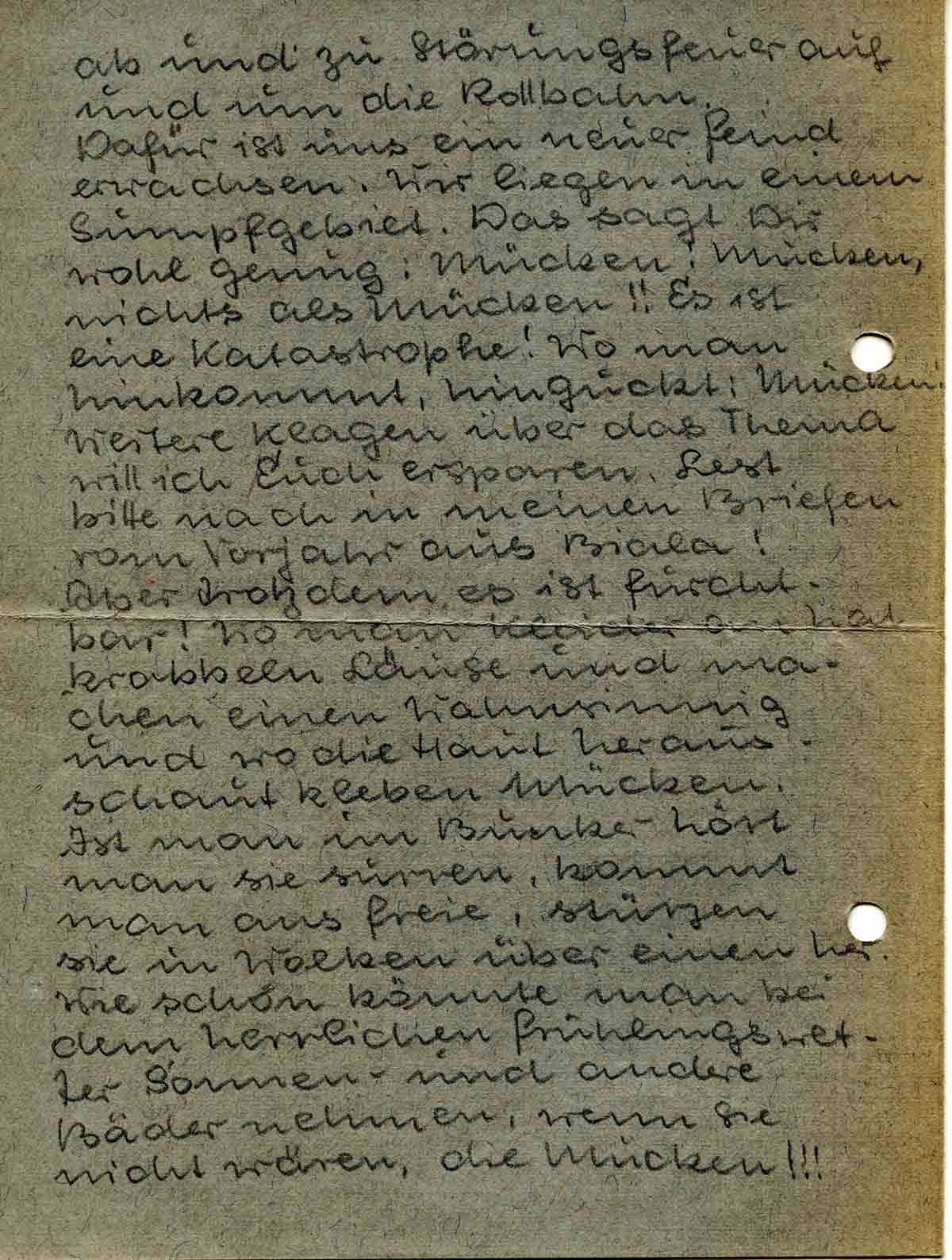 Dafür ist uns ein neuer Feind erwachsen. Wir liegen in einem Sumpfgebiet. Das sagt Dir wohl genug: Mücken! Mücken, nichts als Mücken!! Es ist eine Katastrophe! Wo man hinkommt, hinguckt: Mücken! Weitere Klagen über das Thema will ich Euch ersparen. Lest bitte nach in meinen Briefen vom Vorjahr aus Biala! Aber trotzdem es ist furchtbar! Wo man Kleider an hat krabbeln Läuse und machen einen wahnsinnig und wo die Haut herausschaut kleben Mücken. Ist man im Bunker hört man sie surren, kommt man ans Freie, stürzen sie in Wolken über einen her. Wie schön könnte man bei dem herrlichen Frühlingswetter Sonnen- und andere Bäder nehmen, wenn sie nicht wären, die Mücken!!!