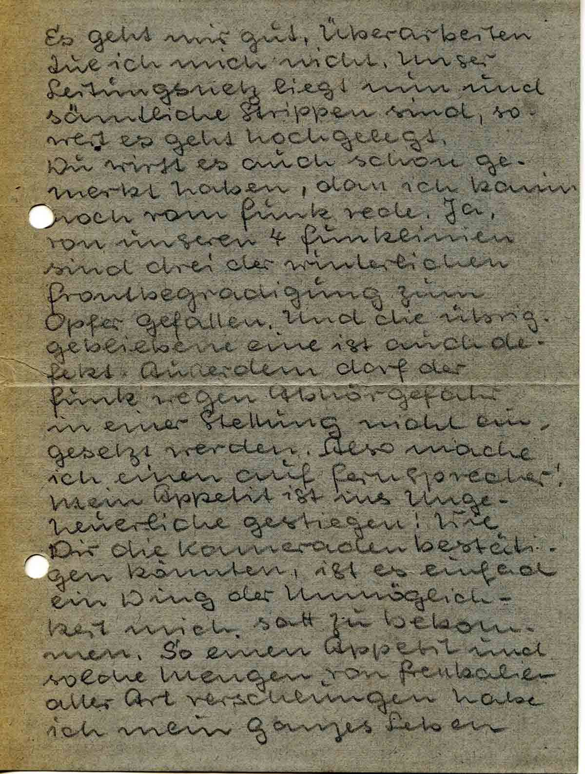 Du wirst es auch schon gemerkt haben, dass ich kaum noch vom Funk rede. Ja, von unseren 4 Funklinien sind drei der winterlichen Frontbegradigung zum Opfer gefallen. Und die übriggebliebene eine ist auch defekt. Ausserdem darf der Funk wegen Abhörgefahr in einer Stellung nicht eingesetzt werden. Also mache ich einen auf Fernsprecher! Mein Appetit ist ins Ungeheuerliche gestiegen! Wie Dir die Kameraden bestätigen könnten, ist es einfach ein Ding der Unmöglichkeit mich satt zu bekommen. So einen Appetit und solche Mengen von Fressalien aller Art verschlungen habe ich mein ganzes Leben