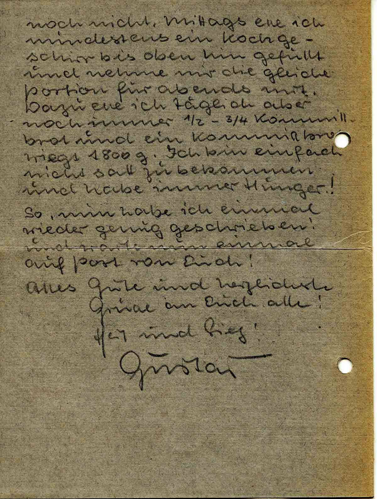 noch nicht. Mittags esse ich mindestens ein Kochgeschirr bis oben hin gefüllt und nehme mir die gleiche Portion für abends mit. Dazu esse ich täglich aber noch immer ½ - ¾ Kommissbrot und ein Kommissbrot wiegt 1800 g. Ich bin einfach nicht satt zu bekommen und habe immer Hunger!