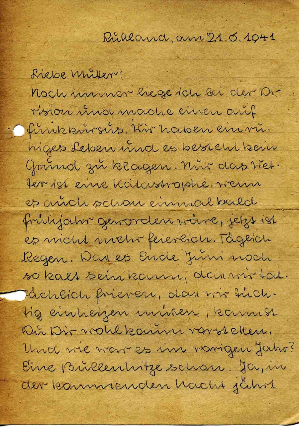 Noch immer liege ich bei der Division und mache einen auf Funkkursus. Wir haben ein ruhiges Leben und es besteht kein Grund zu klagen. Nur das Wetter ist eine Katastrophe, wenn es auch schon einmal bald Frühjahr geworden wäre, jetzt ist es nicht mehr feierlich. Täglich Regen. Dass es Ende Juni noch so kalt sein kann, dass wir tatsächlich frieren, dass wir tüchtig einheizen müssen, kannst Du Dir wohl kaum vorstellen. Und wie war es im vorigen Jahr? Eine Bullenhitze schon. Ja, in der kommenden Nacht jährt