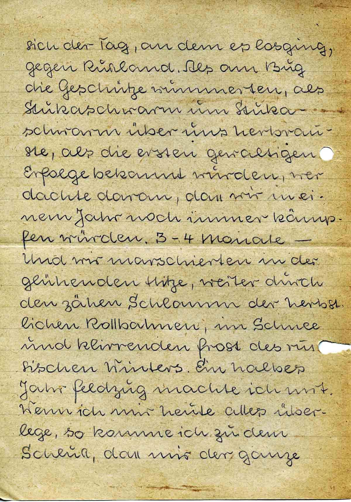 sich der Tag, an dem es losging, gegen Russland. Als am Bug die Geschütze wummerten, als Stukaschwarm um Stukaschwarm über uns herbrauste, als die ersten gewaltigen Erfolge bekannt wurden, wer dachte daran, dass wir in einem Jahr noch immer kämpfen würden. 3-4 Monate – Und wir marschierten in der glühenden Hitze, weiter durch den zähen Schlamm der herbstlichen Rollbahnen, im Schnee und klirrenden Frost des russischen Winters. Ein halbes Jahr Feldzug machte ich mit. Wenn ich mir heute alles überlege, so komme ich zu dem Schluss, dass mir der ganze