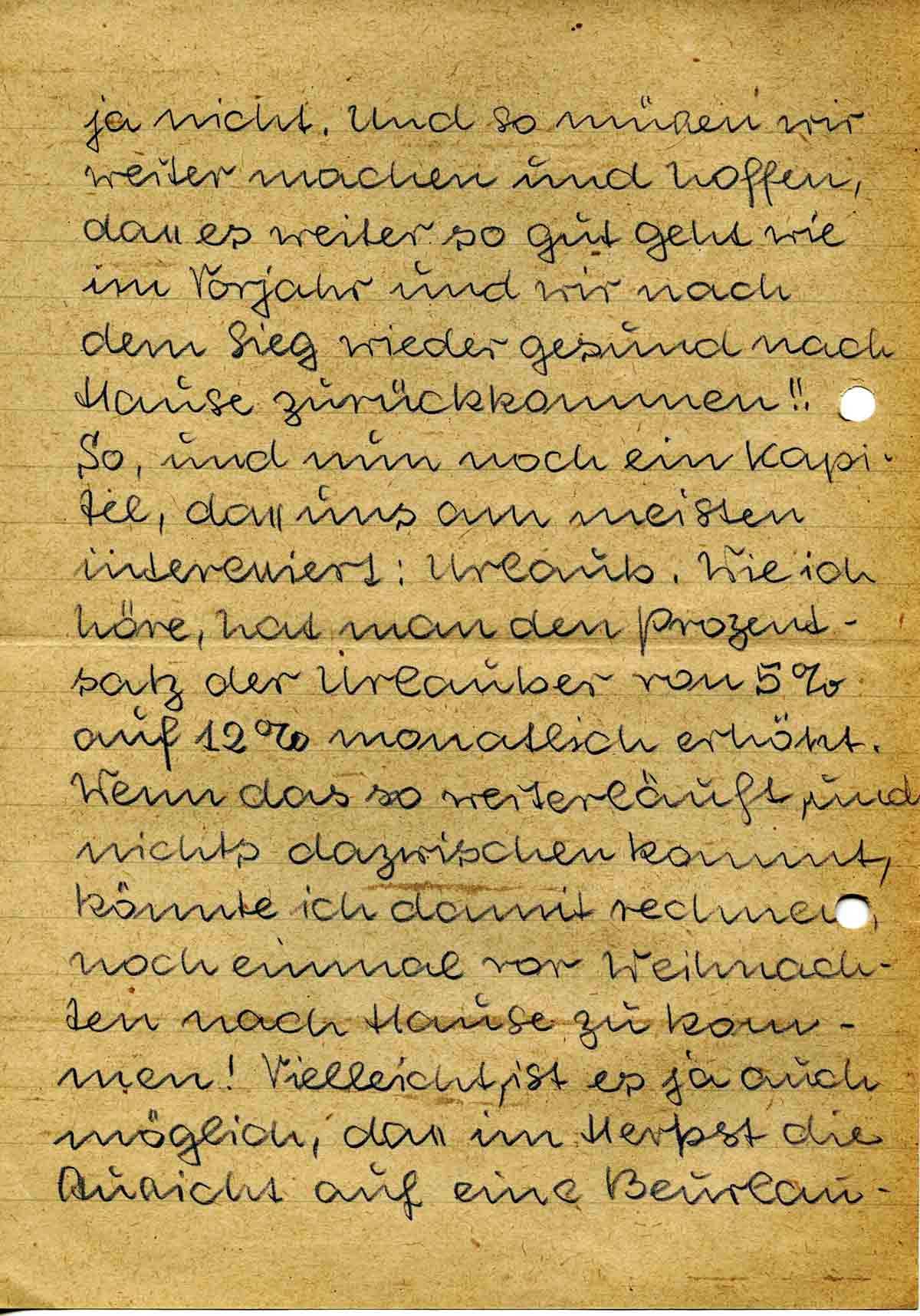 So, und nun noch ein Kapitel, dass uns am meisten interessiert: Urlaub. Wie ich höre, hat man den Prozentsatz der Urlauber von 5 % auf 12 % monatlich erhöht. Wenn das so weiterläuft und nichts dazwischen kommt, könnte ich damit rechnen, noch einmal vor Weihnachten nach Hause zu kommen! Vielleicht ist es ja auch möglich, dass im Herbst die Aussicht auf eine Beurlau-