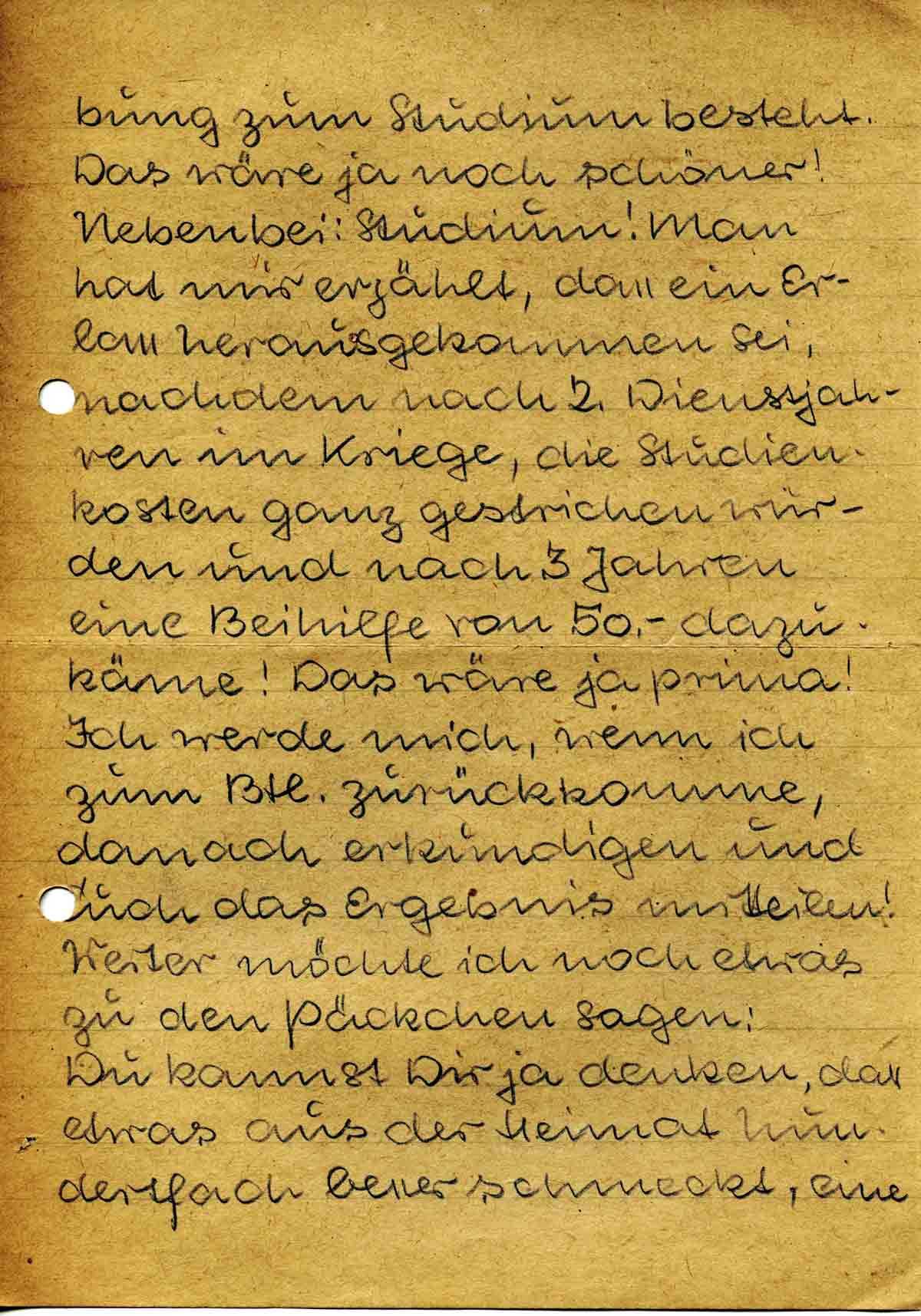 bung zum Studium besteht. Das wäre ja noch schöner! Nebenbei: Studium! Man hat mir erzählt, dass ein Erlass herausgekommen sei, nachdem nach 2 Dienstjahren im Kriege, die Studienkosten ganz gestrichen würden und nach 3 Jahren eine Beihilfe von 50,- dazukäme! Das wäre ja prima! Ich werde mich, wenn ich zum Btl. zurückkomme, danach erkundigen und Euch das Ergebnis mitteilen!