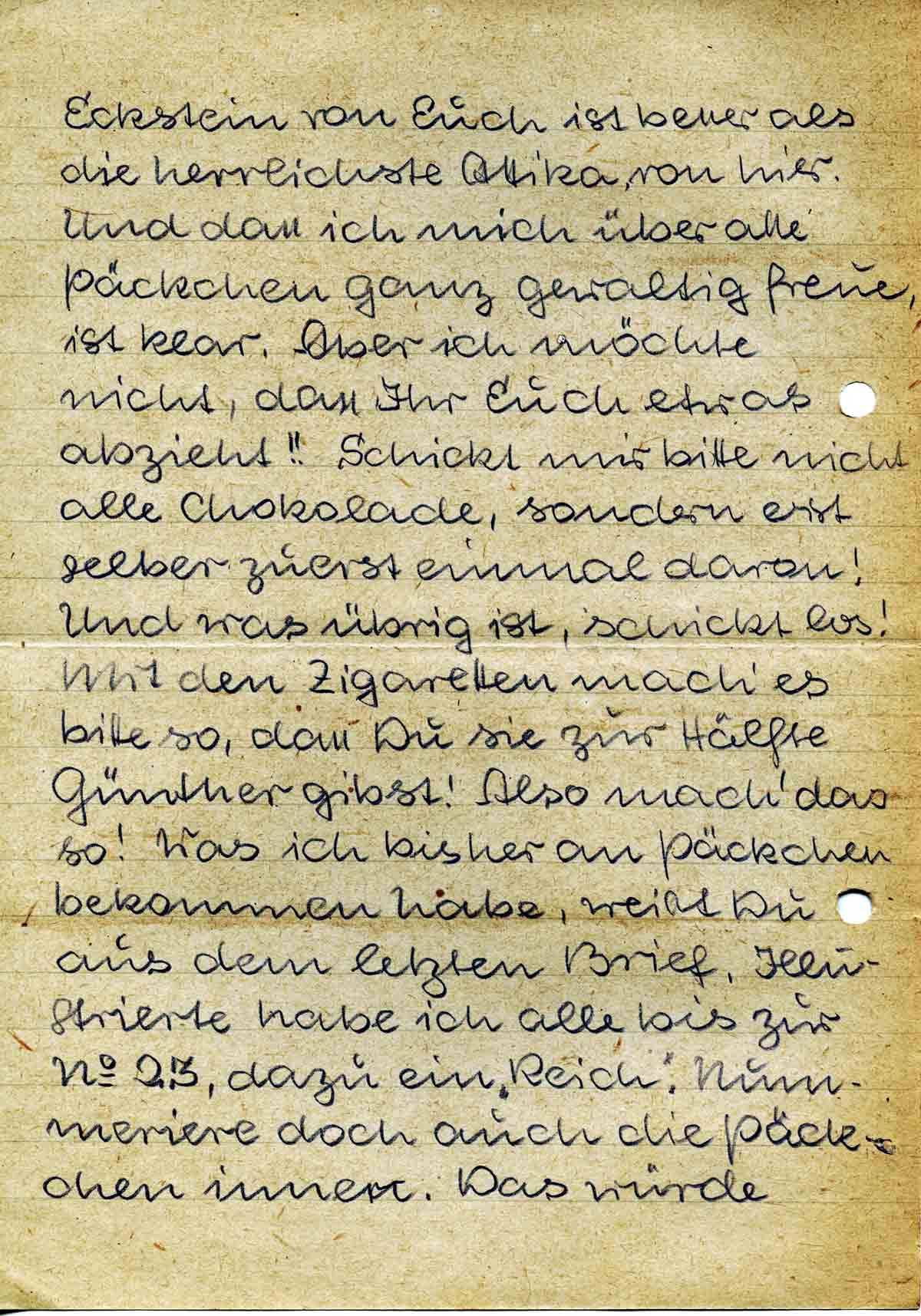 Eckstein von Euch ist besser als die herrlichste Attika von hier. Und dass ich mich über alle Päckchen ganz gewaltig freue, ist klar. Aber ich möchte nicht, dass Ihr Euch etwas abzieht!! Schickt mir bitte nicht alle Chokolade, sondern esst selber zuerst einmal davon! Und was übrig ist, schickt los! Mit den Zigaretten mach’ es bitte so, dass Du sie zur Hälfte Günther gibst! Also mach’ das so! Was ich bisher an Päckchen bekommen habe, weisst Du aus dem letzten Brief. Illustrierte habe ich alle bis zur No. 23, dazu ein „Reich“. Nummeriere doch auch die Päckchen immer. Das würde
