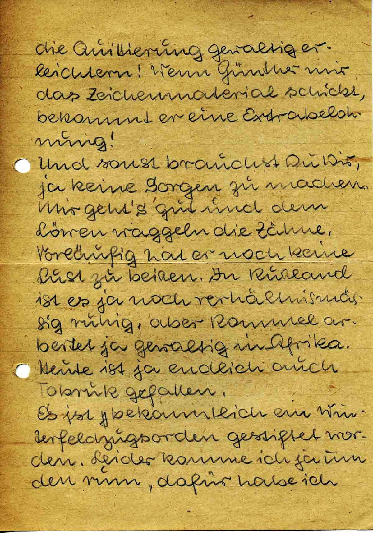 Und sonst brauchst Du Dir, ja keine Sorgen zu machen. Mir geht’s gut und dem Löwen waggeln die Zähne. Vorläufig hat er noch keine Lust zu beissen. In Russland ist es ja noch verhältnismässig ruhig, aber Rommel arbeitet ja gewaltig in Afrika. Heute ist ja endlich auch Tobruk gefallen.