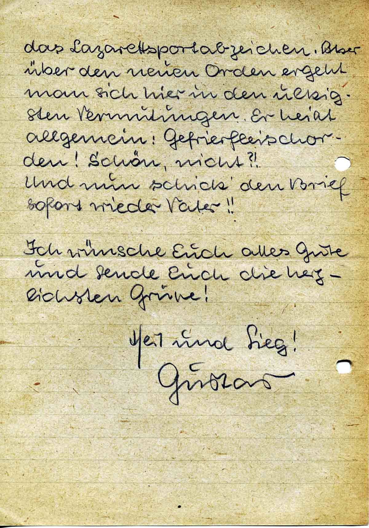 Feldzug an und für sich nicht soviel geschadet hat. Ja, wir haben verdammt viel mitmachen müssen, vieles, dass uns vorher unmöglich schien, durchhalten müssen, aber wir alle sind dadurch härter geworden, hier haben wir gelernt unser Zuhause und unsere Heimat zu schätzen und durch den Krieg haben wir über manches nachgedacht und auch anders gedacht. Körperlich glaube ich auch nicht, dass mir dieses alles geschadet hat. Damit ist natürlich nicht gesagt, dass der Feldzug ein angenehmes Erlebnis war. Aber danach fragt man uns