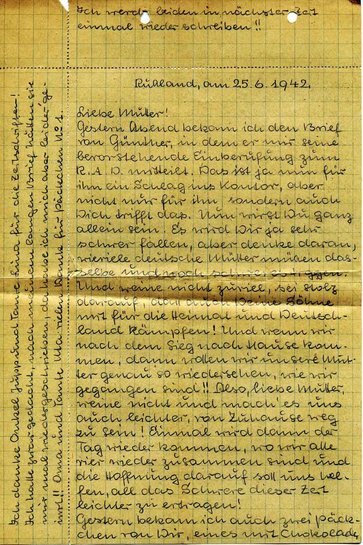 Gestern Abend bekam ich den Brief von Günther, in dem er mir seine bevorstehende Einberufung zum R.A.D. mitteilt. Das ist ja nun für ihn ein Schlag ins Kontor, aber nicht nur für ihn, sondern auch Dich trifft das. Nun wirst Du ganz allein sein. Es wird Dir ja sehr schwer fallen, aber denke daran, wieviele deutsche Mütter müssen dasselbe und noch schweres tragen. Und weine nicht zuviel, sei stolz darauf, dass auch Deine Söhne mit für die Heimat und Deutschland kämpfen! Und wenn wir nach dem Sieg nach Hause kommen, dann wollen wir unsere Mutter genau so wiedersehen, wie wir gegangen sind!! Also, liebe Mutter, weine nicht und mach’ es uns auch leichter, von Zuhause weg zu sein! Einmal wird dann der Tag wieder kommen, wo wir alle vier wieder zusammen sind und die Hoffnung darauf soll uns helfen, all das Schwere dieser Zeit leichter zu ertragen!