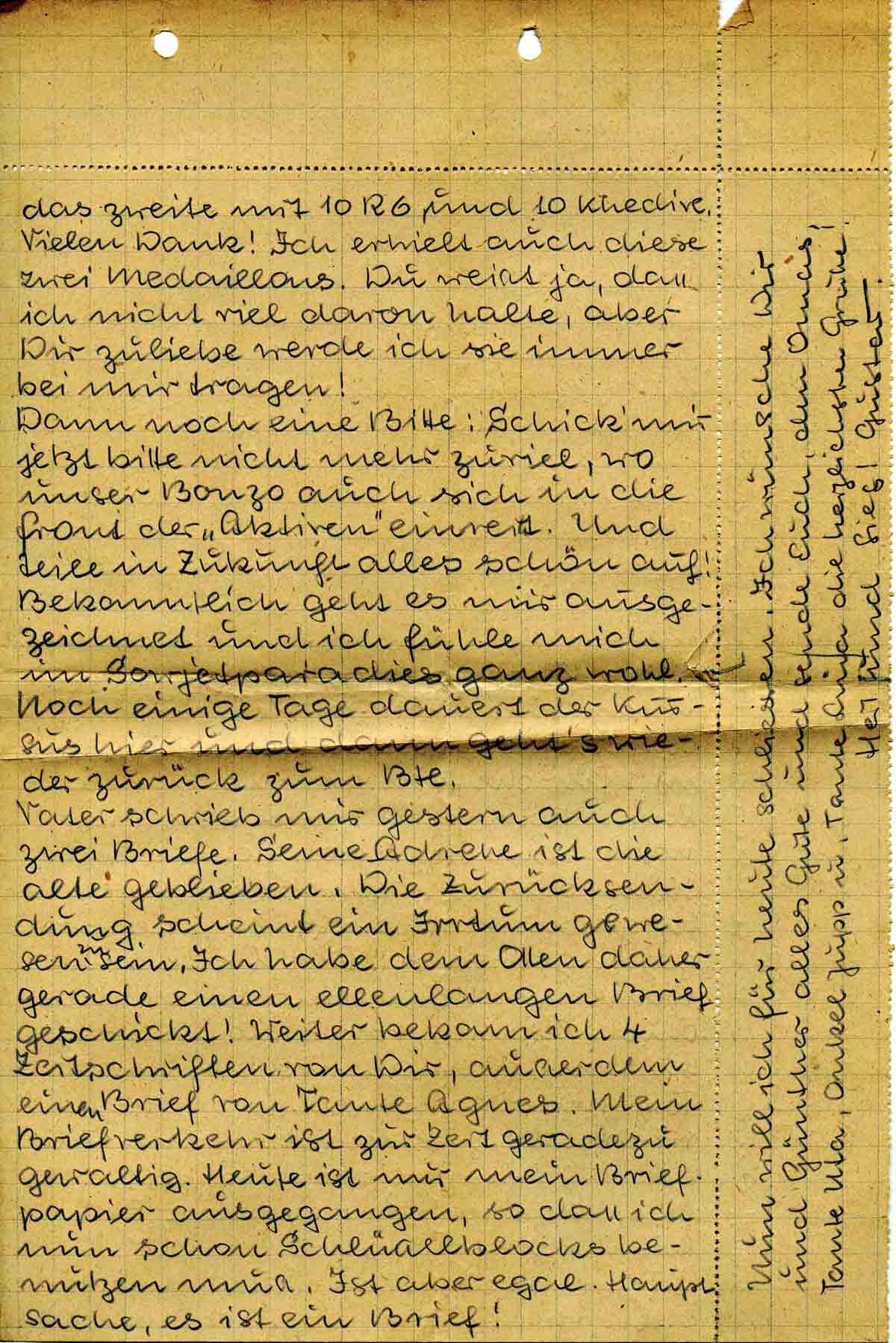 Vater schrieb mir gestern auch zwei Briefe. Seine Adresse ist die alte geblieben. Die Zurücksendung scheint ein Irrtum gewesen zu sein. Ich habe dem Ollen daher gerade einen ellenlangen Brief geschickt! Weiter bekam ich 4 Zeitschriften von Dir, ausserdem einen Brief von Tante Agnes. Mein Briefverkehr ist zur Zeit geradezu gewaltig. Heute ist mir mein Briefpapier ausgegangen, so dass ich nun schon Schlüsselblocks benutzen muss. Ist aber egal. Hauptsache, es ist ein Brief!