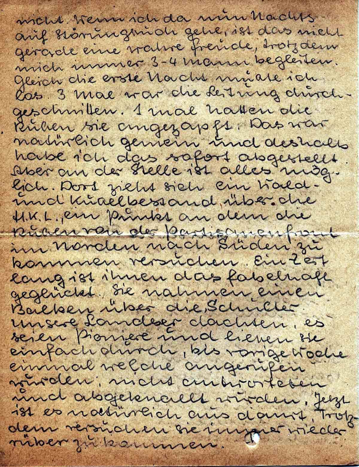 nicht. Wenn ich da nun Nachts auf Störungssuche gehe, ist das nicht gerade eine wahre Freude, trotzdem mich immer 3-4 Mann begleiten. Gleich die erste Nacht musste ich los. 3 Mal war die Leitung durchgeschnitten. 1 mal hatten die Russen sie angezapft. Das war natürlich gemein und deshalb habe ich das sofort abgestellt. Aber an der Stelle ist alles möglich. Dort zieht sich ein Wald- und Ku[?]elbestand über die H.K.L., ein Punkt an dem die Russen von der Partisanenfront im Norden nach Süden zu kommen versuchen. Ein Zeitlang ist ihnen das fabelhaft geglückt. Sie nahmen einen Balken über die Schulter. Unsere Landser dachten, es seien Pioniere und liessen sie einfach durch, bis vorige Woche einmal welche angerufen wurden, nicht antworteten und abgeknallt wurden. Jetzt ist es natürlich aus damit. Trotzdem versuchen sie immer wieder rüber zu kommen.