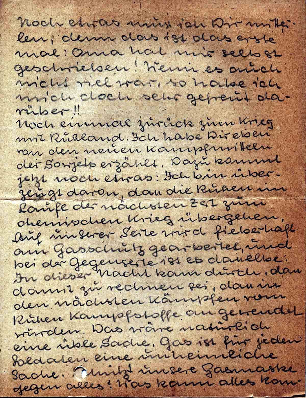 Noch einmal zurück zum Krieg mit Russland. Ich habe Dir eben von den neuen Kampfmitteln der Sowjets erzählt. Dazu kommt jetzt noch etwas: Ich bin überzeugt davon, dass die Russen im Laufe der nächsten Zeit zum chemischen Krieg übergehen. Auf unserer Seite wird fieberhaft am Gasschutz gearbeitet, und bei der Gegenseite ist es dasselbe: In dieser Nacht kam durch, dass damit zu rechnen sei, dass in den nächsten Kämpfen vom Russen Kampfstoffe angewendet würden. Das wäre natürlich eine üble Sache. Gas ist für jeden Soldaten eine unheimliche Sache. Schützt unsere Gasmaske gegen alles? Was kann alles kom-