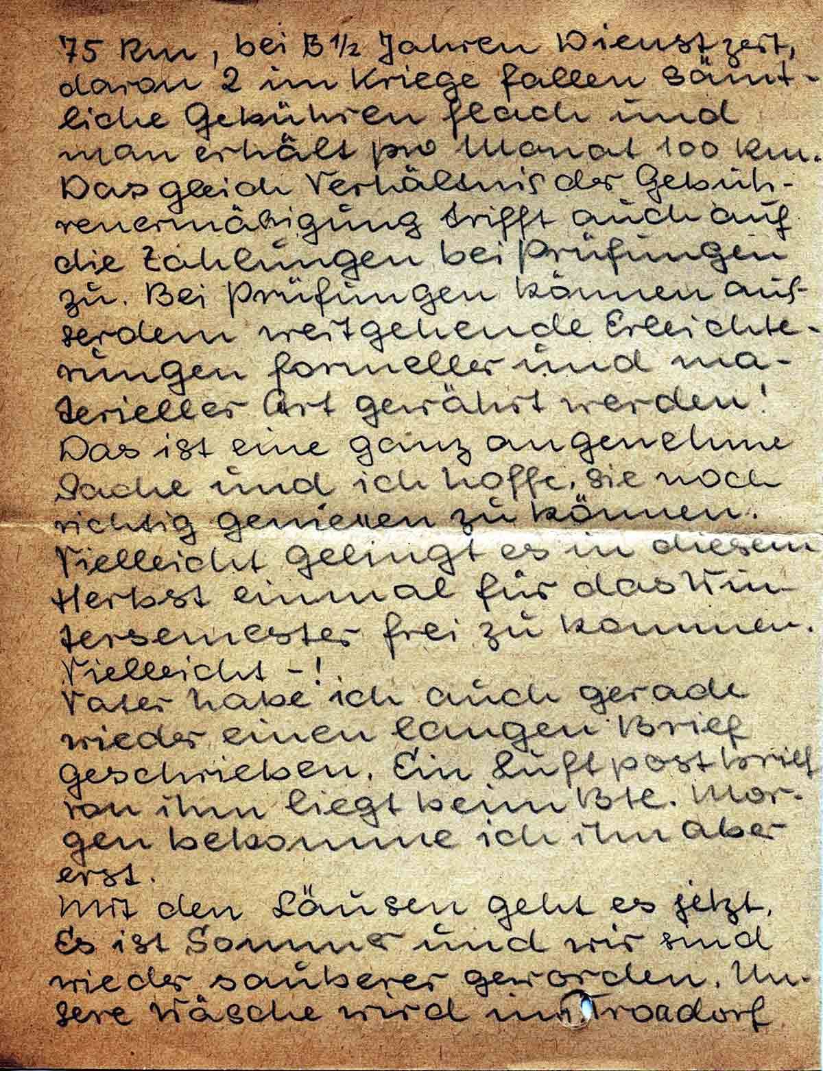 Nun zum Thema! Und zwar Ermäßigungen der Studienkosten. Ich habe das betreffende Verordnungsblatt gelesen und zwar stand darin, dass Studenten mit 2 Jahren Dienstzeit, davon ½ Jahr im Kriege haben eine Ermäßigung der Gesamtgebühren von 25 % und eine Beihilfe zu den Unterhaltskosten von 25 Rm pro Monat. Bei 2 ½, davon 1 Jahr im Krieg, 50 % und 50 Rm, bei 3 Jahren, davon 1 ½ im Krieg, 75 % und