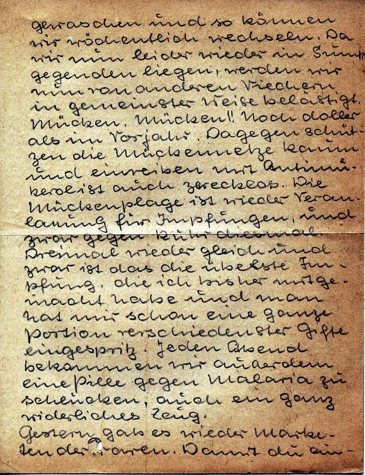 gewaschen und so können wir wöchentlich wechseln. Da wir nun leider wieder in Sumpfgegenden liegen, werden wir nun von anderen Viechern in gemeinster Weise belästigt. Mücken. Mücken!! Noch doller als im Vorjahr. Dagegen schützen die Mückennetze kaum und einreiben mit Antimükerol ist auch zwecklos. Die Mückenplage ist wieder Veranlassung für Impfungen, und zwar gegen Ruhr diesmal. Dreimal wieder gleich und zwar ist das die übelste Impfung, die ich bisher mitgemacht habe und man hat mir schon eine ganze Portion verschiedenster Gifte eingespritzt. Jeden Abend bekommen wir außerdem eine Pille gegen Maleria zu schlucken, auch ein ganz widerliches Zeug.