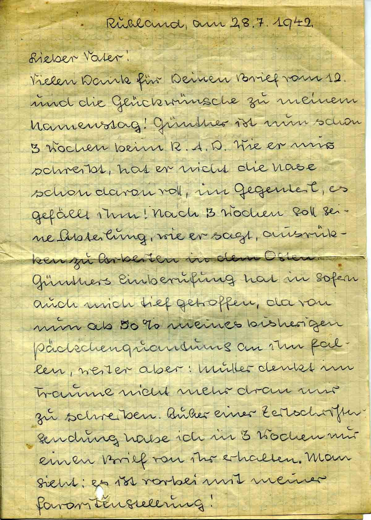 Vielen Dank für Deinen Brief vom 12. und die Glückwünsche zu meinem Namenstag! Günther ist nun schon 3 Wochen beim R.A.D. Wie er mir schreibt, hat er nicht die Nase schon davon voll, im Gegenteil, es gefällt ihm! Nach 3 Wochen soll seine Abteilung, wie er sagt, ausrücken zu Arbeiten in dem Osten.