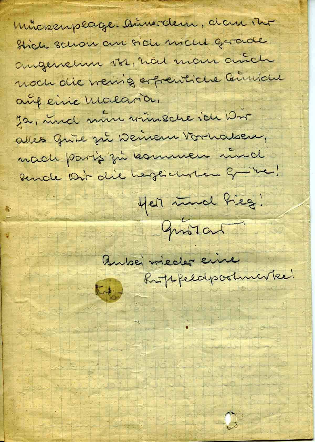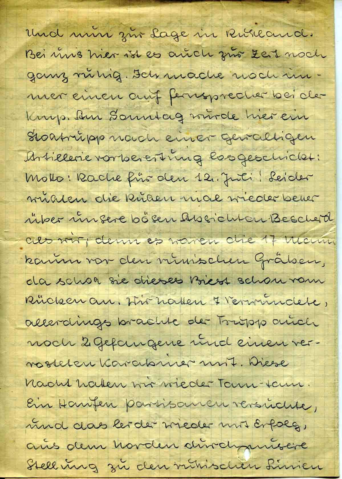 Und nun zur Lage in Russland. Bei uns hier ist es auch zur Zeit noch ganz ruhig. Ich mache noch immer einen auf Fernsprecher bei der Kmp. Am Sonntag wurde hier ein Stoßtrupp nach einer gewaltigen Artillerievorbereitung losgeschickt: Motto: Rache für den 12. Juli! Leider wußten die Russen mal wieder besser über unsere bösen Absichten Bescheid als wir; denn es waren die 17 Mann kaum vor den russischen Gräben, da schoss sie dieses Biest schon vom Rücken an. Wir hatten 7 Verwundete, allerdings brachte der Trupp auch noch 2 Gefangene und einen verrosteten Karabiner mit. Diese Nacht hatten wir wieder Tam-tam. Ein Haufen Partisanen versuchte, und das leider wieder mit Erfolg, aus dem Norden durch unsere Stellung zu den russischen Linien