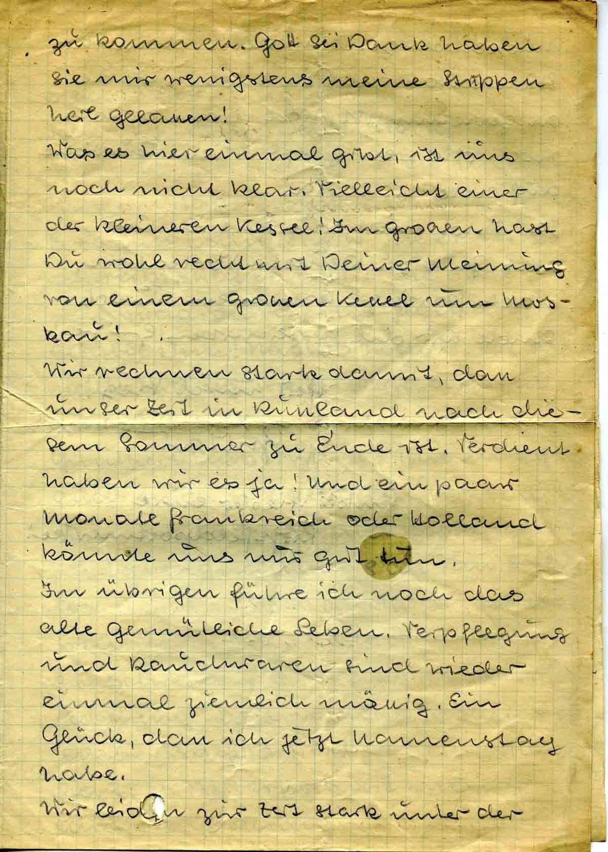 Günthers Einberufung hat in sofern auch mich tief getroffen, da von nun ab 50 % meines bisherigen Päckchenquantums an ihn fallen, weiter aber: Mutter denkt im Traume nicht mehr dran nur zu schreiben. Außer einer Zeitschriftensendung habe ich in 3 Wochen nur einen Brief von ihr erhalten. Man sieht: es ist vorbei mit meiner Favoritenstellung!