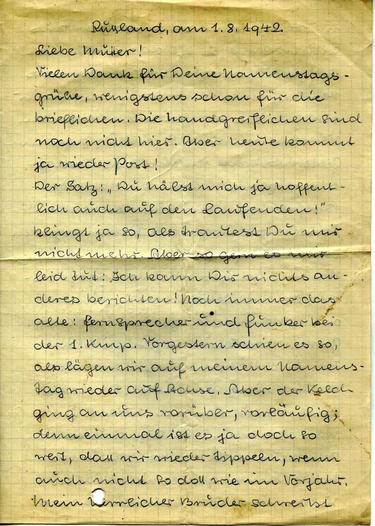Gustav Roos an Mutter Elisabeth, 1. August 1942