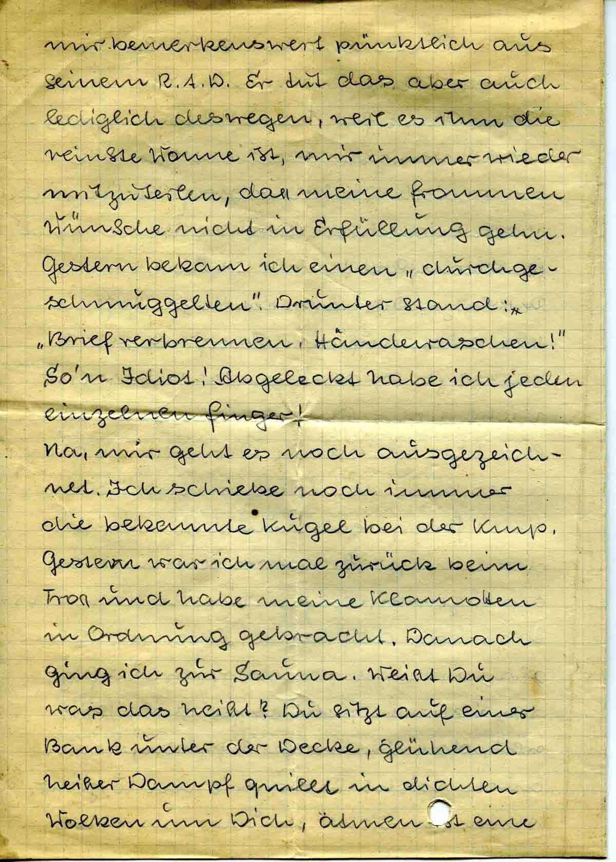 mir bemerkenswert pünktlich aus seinem R.A.D. Er tut das aber auch lediglich deswegen, weil es ihm die reinste Wonne ist, mir immer wieder mitzuteilen, dass meine frommen Wünsche nicht in Erfüllung gehn. Gestern bekam ich einen „durchgeschmuggelten“. Drunter stand: „Brief verbrennen. Händewaschen!“ So’n Idiot! Abgeleckt habe ich jeden einzelnen Finger!