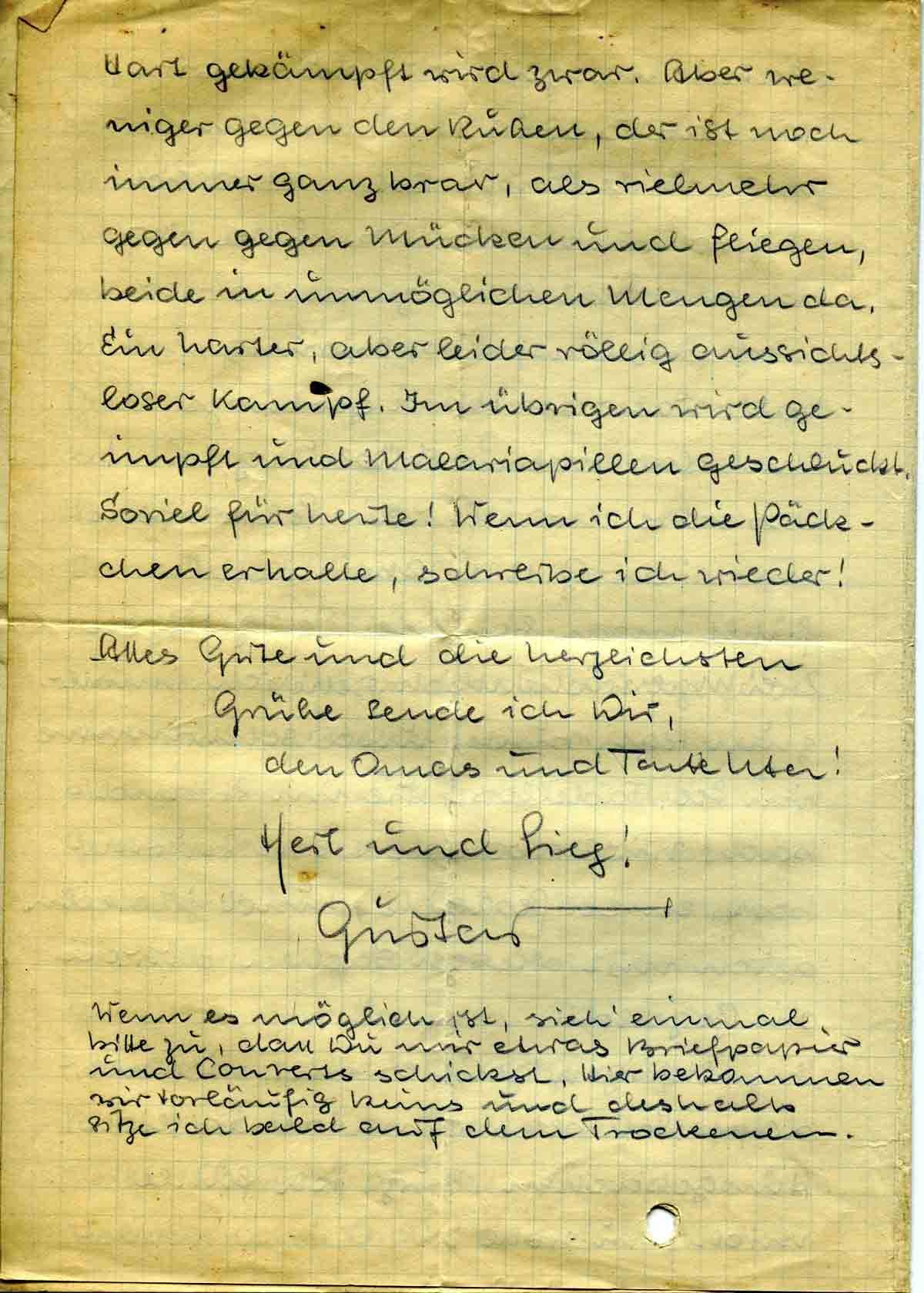 Hart gekämpft wird zwar. Aber weniger gegen den Russen, der ist noch immer ganz brav, als vielmehr gegen gegen Mücken und Fliegen, beide in unmöglichen Mengen da. Ein harter, aber leider völlig aussichtsloser Kampf. Im übrigen wird geimpft und Malariapillen geschluckt. Soviel für heute! Wenn ich die Päckchen erhalte, schreibe ich wieder!