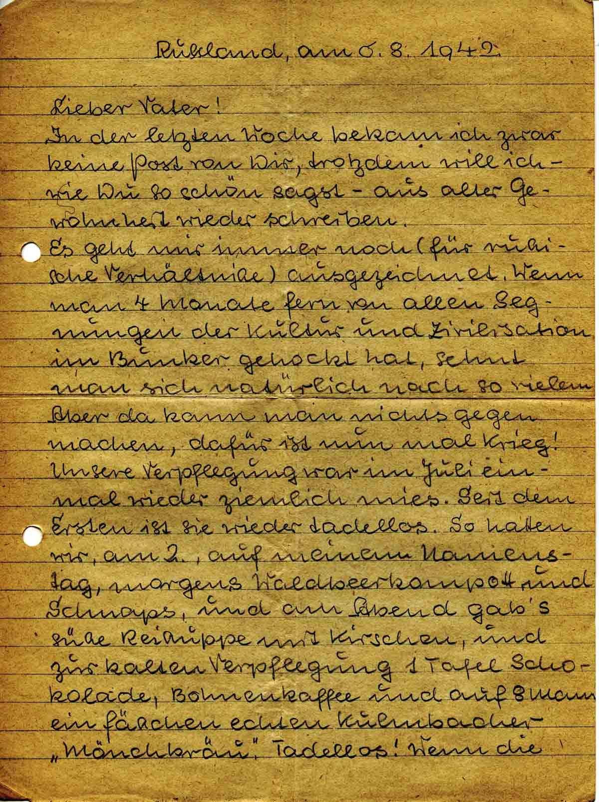 Es geht mir immer noch (für russische Verhältnisse) ausgezeichnet. Wenn man 4 Monate fern von allen Segnungen der Kultur und Zivilisation im Bunker gehockt hat, sehnt man sich natürlich nach so vielem. Aber da kann man nichts gegen machen, dafür ist nun mal Krieg! Unsere Verpflegung war im Juli einmal wieder ziemlich mies. Seit dem Ersten ist sie wieder tadellos. So hatten wir, am 2., auf meinem Namenstag, morgens Waldbeerkompott und Schnaps, und am Abend gab’s süße Reissuppe mit Kirschen, und zur kalten Verpflegung 1 Tafel Schokolade, Bohnenkaffee und auf 8 Mann ein Fäßchen echten Kulmbacher „Mönchbräu“. Tadellos! Wenn die