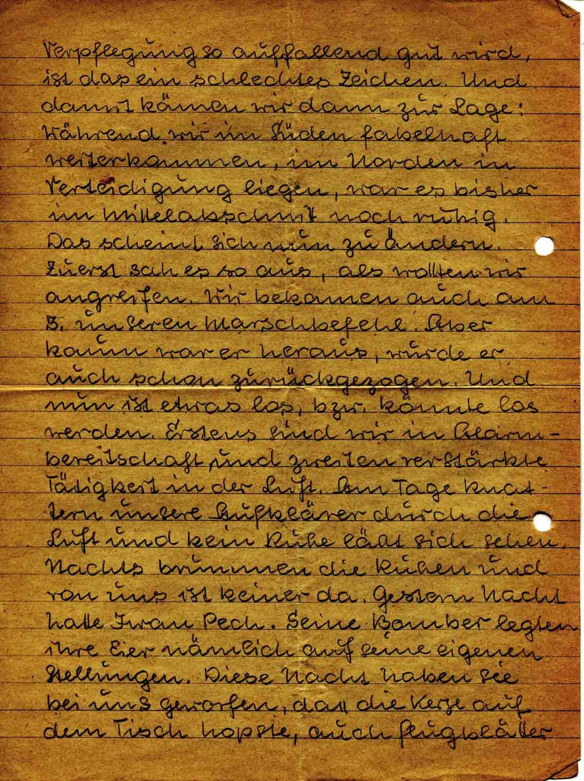 Verpflegung so auffallend gut wird, ist das ein schlechtes Zeichen. Und damit kämen wir dann zur Lage: Während wir im Süden fabelhaft weiterkommen, im Norden in Verteidigung liegen, war es bisher im Mittelabschnitt noch ruhig. Das scheint sich nun zu ändern. Zuerst sah es so aus, als wollten wir angreifen. Wir bekamen auch am 3. unseren Marschbefehl. Aber kaum war er heraus, wurde er auch schon zurückgezogen. Und nun ist etwas los, bzw. könnte los werden. Erstens sind wir in Alarmbereitschaft und zweitens verstärkte Tätigkeit in der Luft. Am Tage knattern unsere Aufklärer durch die Luft und kein Russe läßt sich sehen. Nachts brummen die Russen und von uns ist keiner da. Gestern Nacht hatte Iwan Pech. Seine Bomber legten ihre Eier nämlich auf seine eigenen Stellungen. Diese Nacht haben sie bei uns geworfen, dass die Kerze auf dem Tisch hopste, auch Flugblätter