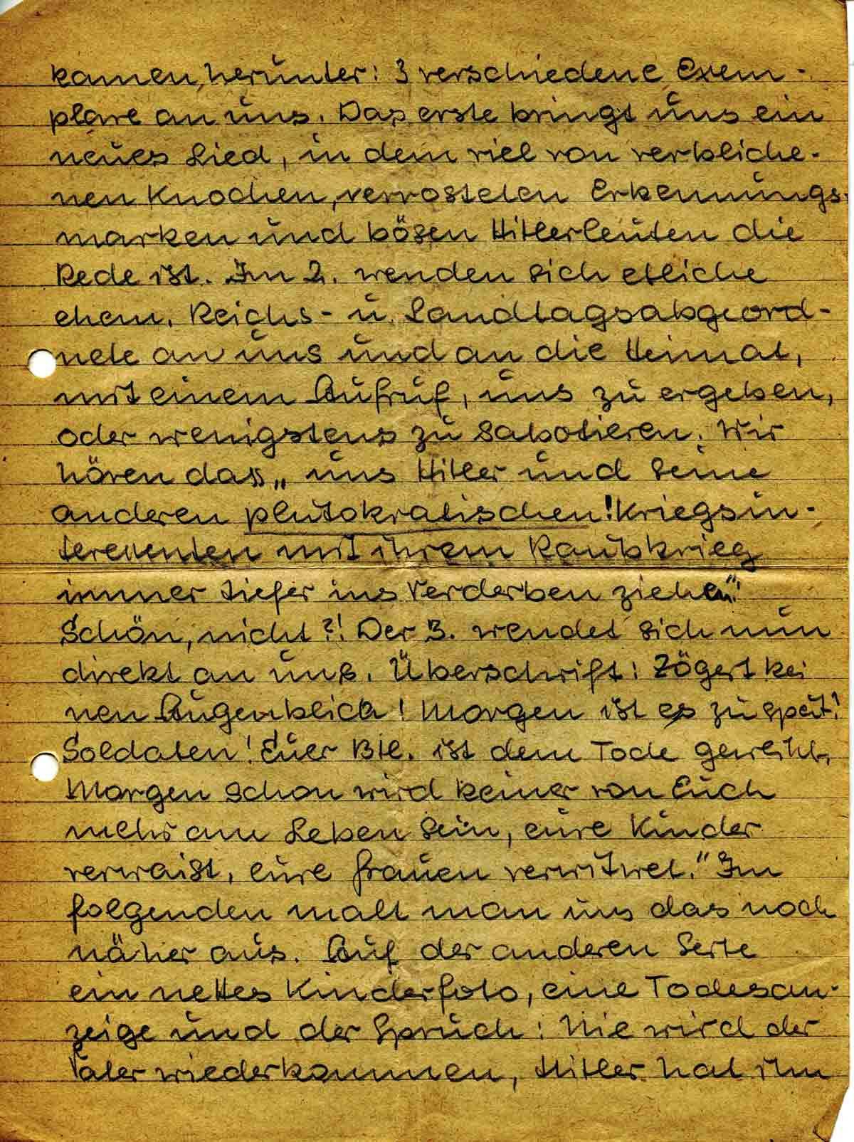 kamen herunter: 3 verschiedene Exemplare an uns. Das erste bringt uns ein neues Lied, in dem viel von verblichenen Knochen, verrosteten Erkennungsmarken und bösen Hitlerleuten die Rede ist. Im 2. wenden sich etliche ehem. Reichs- u. Landtagsabgeordnete an uns und an die Heimat, mit einem Aufruf, uns zu ergeben, oder wenigstens zu sabotieren. Wir hören dass „uns Hitler und seine anderen plutokratischen! Kriegsinteressenten mit ihrem Raubkrieg immer tiefer ins Verderben ziehen“. Schön, nicht?! Der 3. wendet sich nun direkt an uns. Überschrift: Zögert keinen Augenblick! Morgen ist es zu spät! Soldaten! Euer Btl. ist dem Tode geweiht. Morgen schon wird keiner von Euch mehr am Leben sein, eure Kinder verwaist, eure Frauen verwitwet“. Im folgenden malt man uns das noch näher aus. Auf der anderen Seite ein nettes Kinderfoto, eine Todesanzeige und der Spruch: Nie wird der Vater wiederkommen, Hitler hat ihm ihn