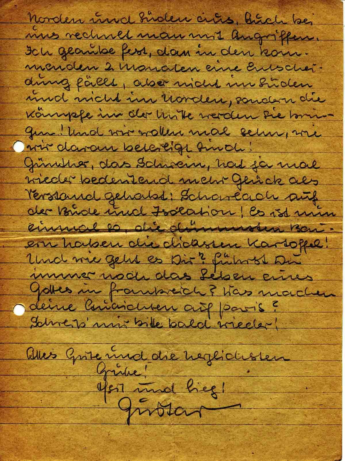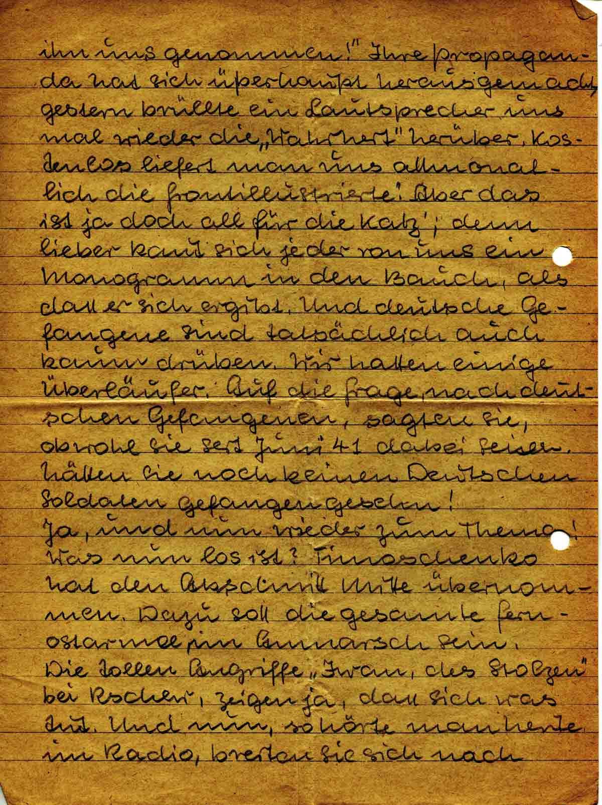 uns genommen!“ Ihre Propaganda hat sich überhaupt herausgemacht, gestern brüllte ein Lautsprecher uns mal wieder die „Wahrheit“ herüber. Kostenlos liefert man uns allmonatlich die Frontillustrierte. Aber das ist ja doch all für die Katz’; denn lieber kaut sich jeder von uns ein Monogramm in den Bauch, als dass er sich ergibt. Und deutsche Gefangene sind tatsächlich auch kaum drüben. Wir hatten einige Überläufer. Auf die Frage nach deutschen Gefangenen, sagten sie, obwohl sie seit Juni 41 dabei seien, hätten sie noch keinen Deutschen Soldaten gefangen gesehn!